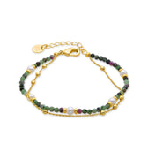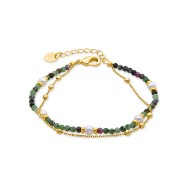 Pulsera de metal Rayja de Perla Blanca acabada en oro amarillo de 18k. El estilo Boho es una estética de espíritu libre que mezcla diferentes culturas y expresiones artísticas en un estilo ecléctico con énfasis en los elementos orgánicos y la naturaleza.
