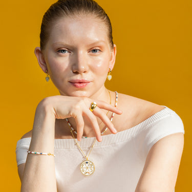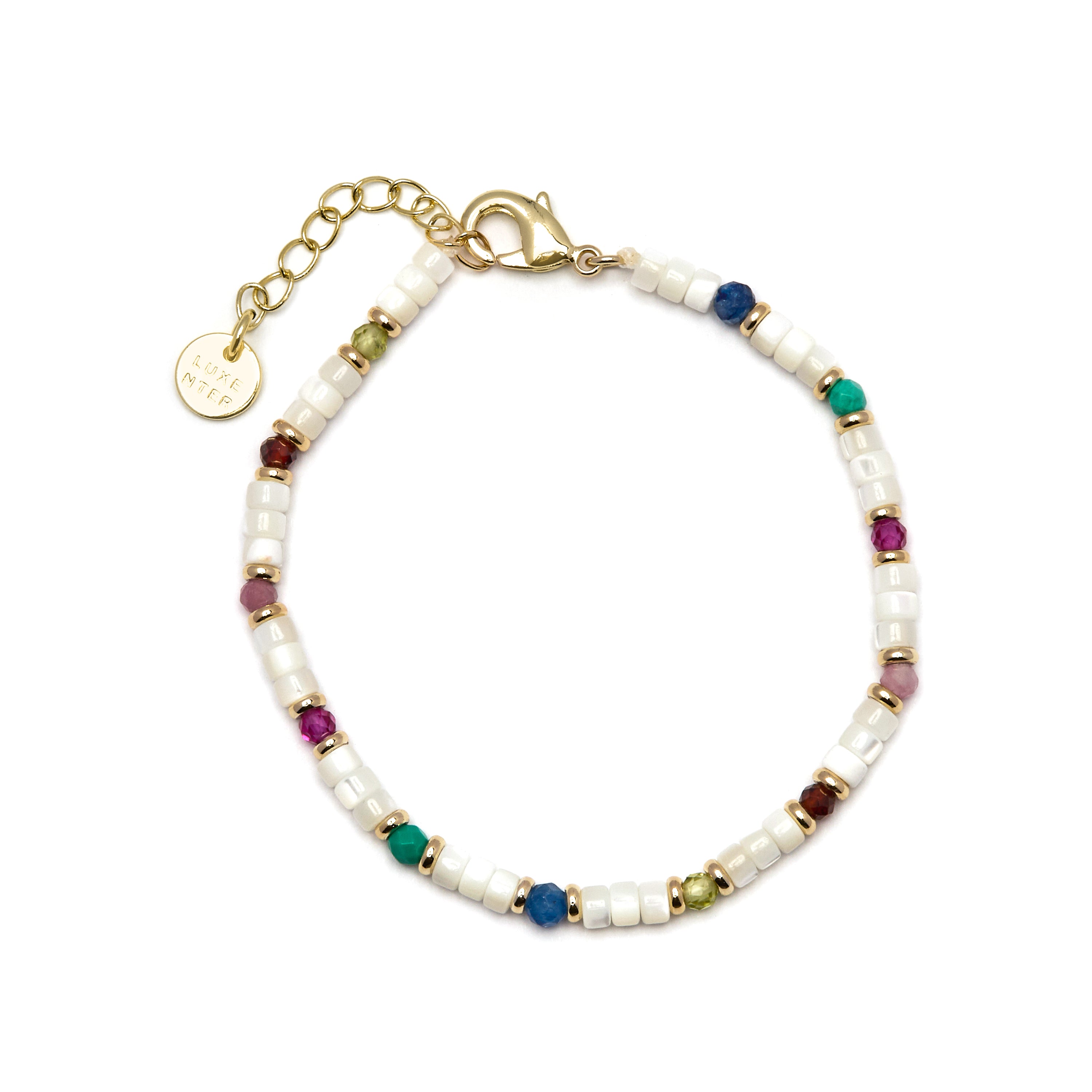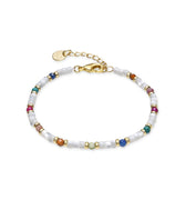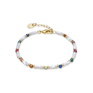 Pulsera de metal Xolau con Madreperla Blanca acabado oro 18k. El estilo Boho es una estética de espíritu libre que mezcla diferentes culturas y expresiones artísticas en un estilo ecléctico con énfasis en los elementos orgánicos y la naturaleza.