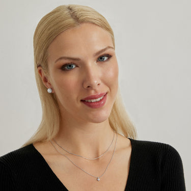 Pendientes básico de plata de ley 925 y perla blanca con acabado en baño de rodio. Essential encarna la sencillez refinada, piezas atemporales con líneas suaves y el brillo adicional de las circonitas. Joyas básicas sin pretensiones que son perfectas para el uso diario, pero también pueden funcionar en ocasiones especiales.