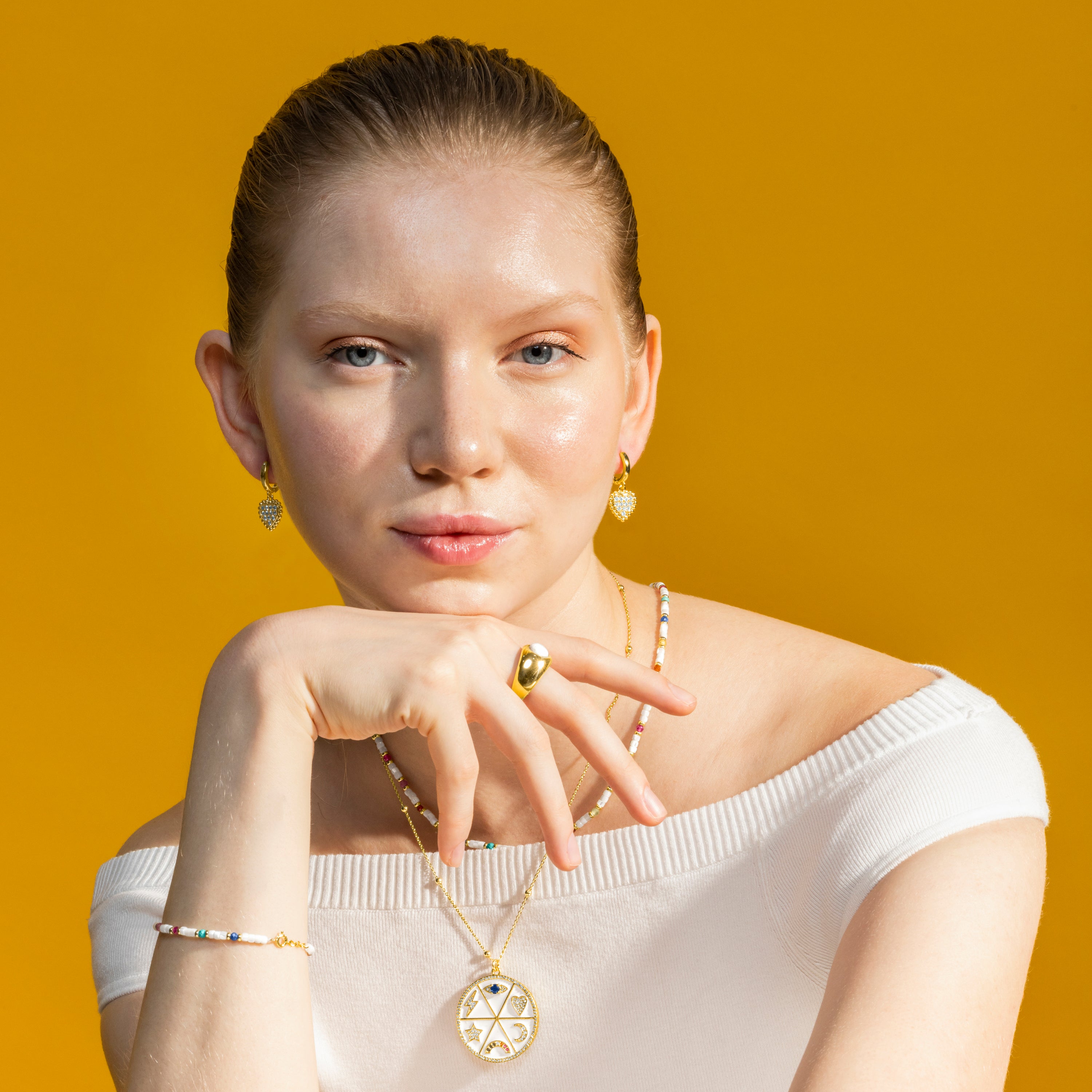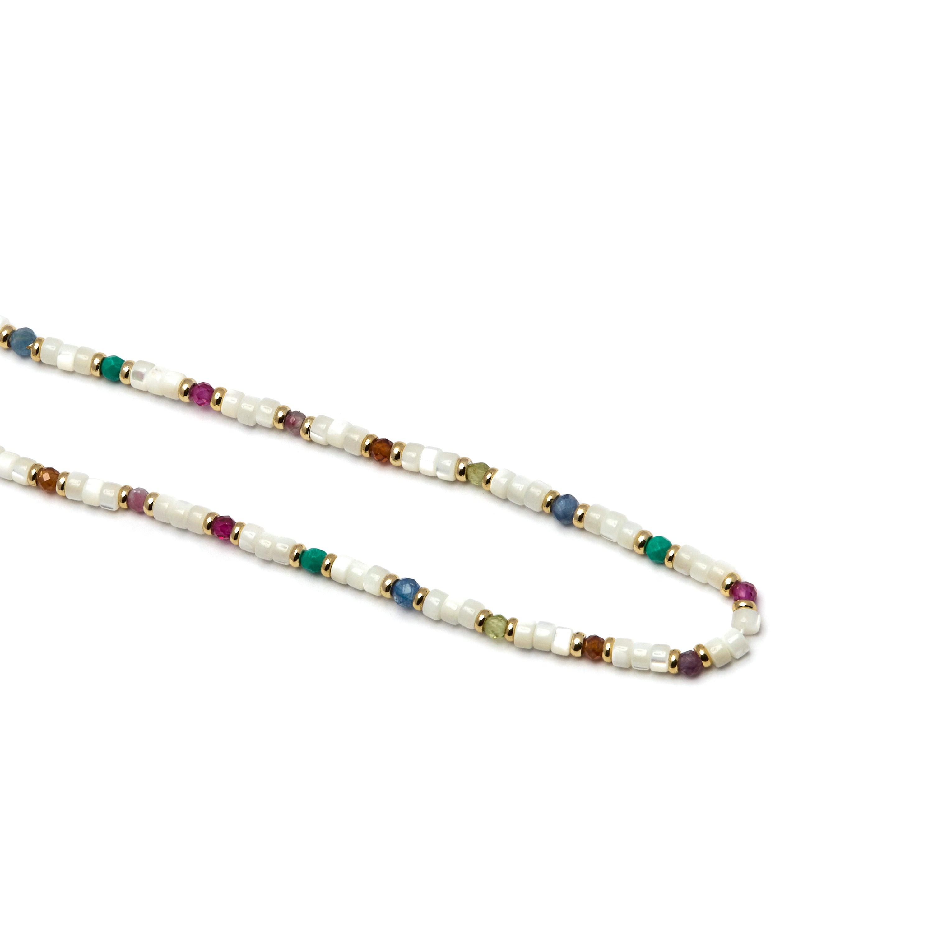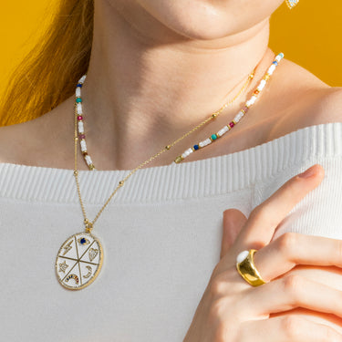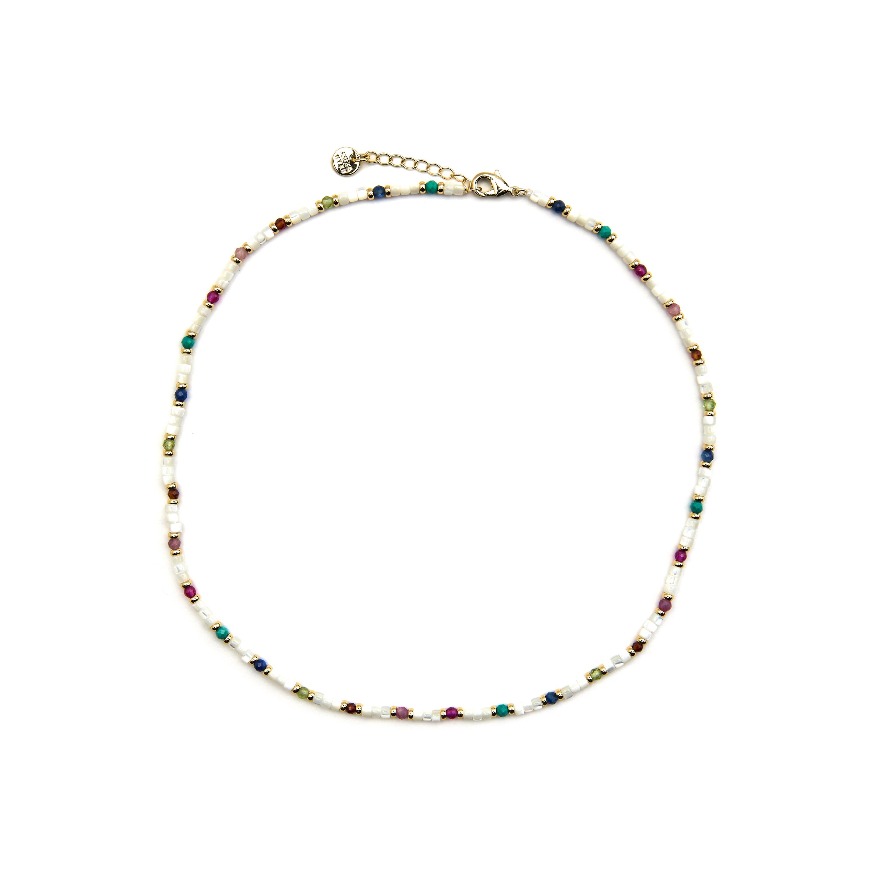 Collar de metal Xolau con Madreperla Blanca acabado oro 18k. El estilo Boho es una estética de espíritu libre que mezcla diferentes culturas y expresiones artísticas en un estilo ecléctico con énfasis en los elementos orgánicos y la naturaleza.