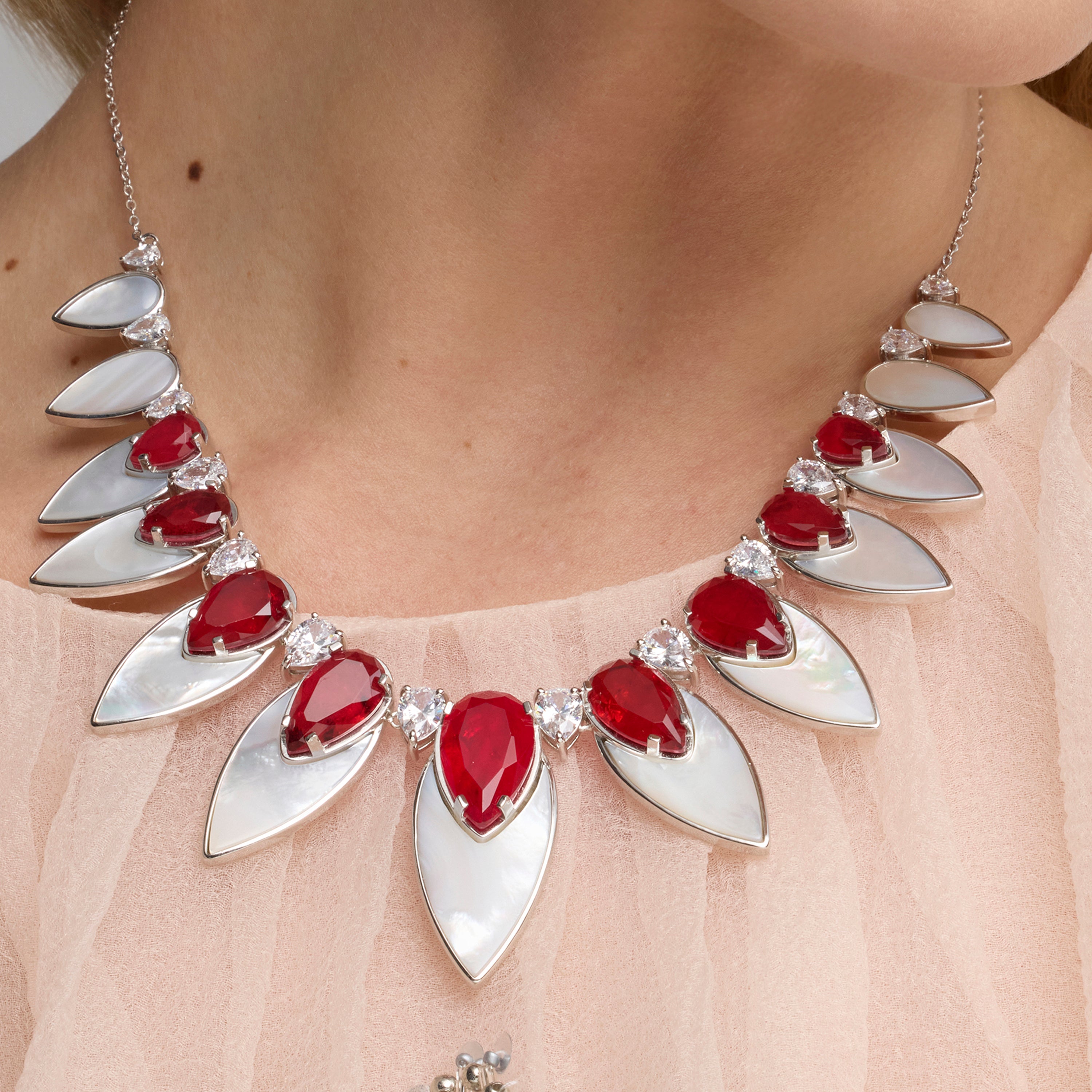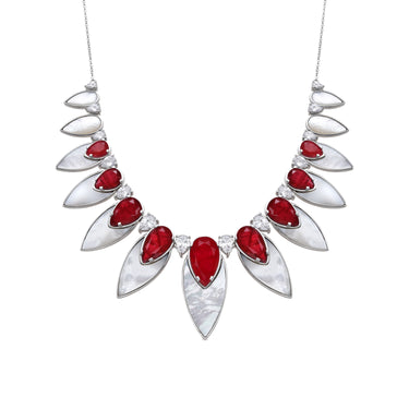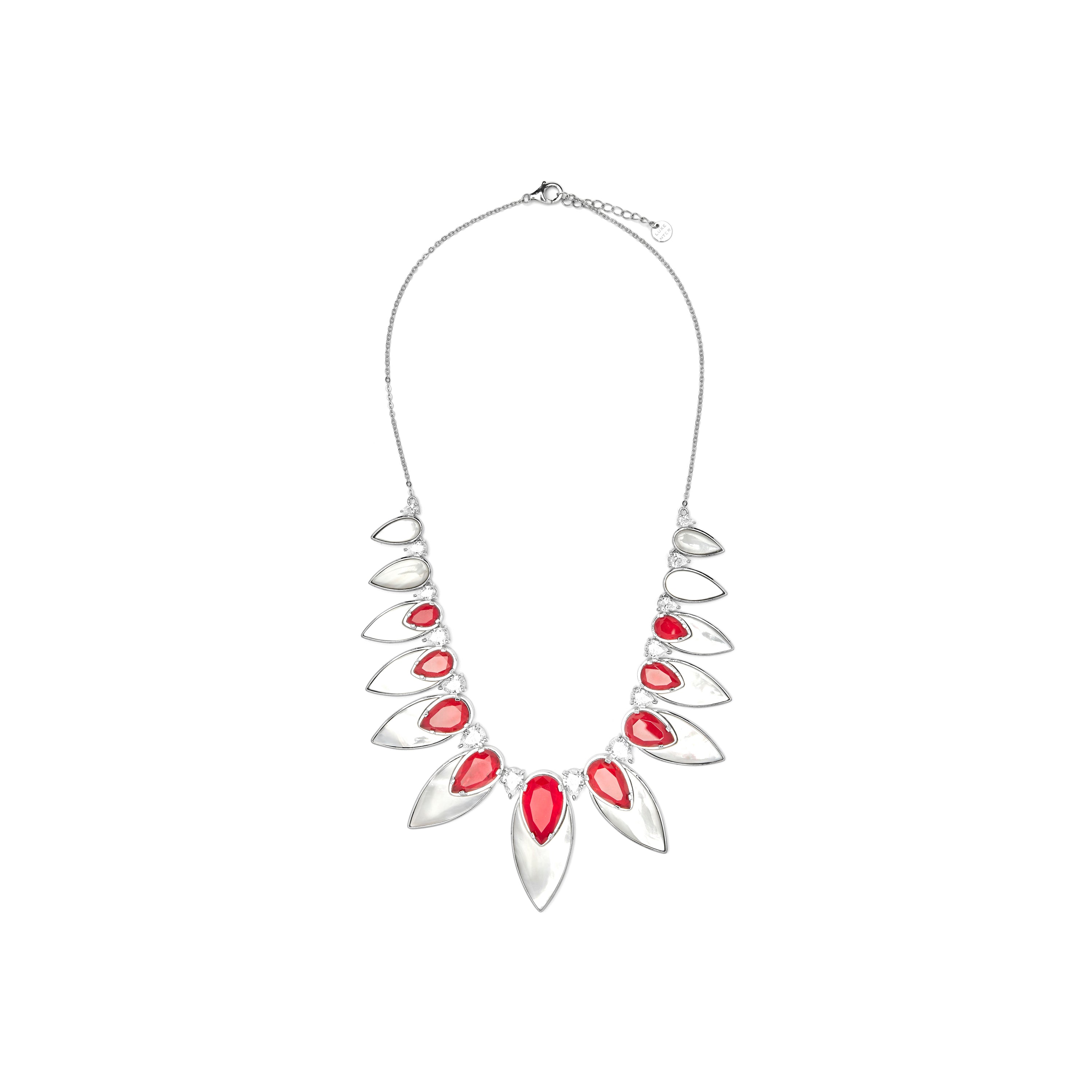 La colección de verano “Fuego y Mar” fusiona la calidez vibrante del rojo con la elegancia natural de la plata. A través del coral y la piedra Fusión, se evocan los tonos intensos del fuego, mientras que los detalles en madreperla y ónix aportan una armonía refrescante que recuerda al mar. Los collares y anillos, de gran volumen y diseño audaz, destacan por su sofisticación, capturando la esencia de dos mundos en un solo accesorio. Esta colección celebra la energía y la belleza de la temporada veraniega con piezas únicas y atemporales.
