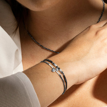Cada joya de esta colección es una obra maestra de artesanía, incorporando collares múltiples que capturan la esencia de la bruma matinal y la delicadeza de las perlas. El hematite, con su brillo metálico y sus propiedades protectoras, se mezcla armoniosamente con la suavidad nacarada de las perlas, creando piezas que son tanto elegantes como poderosas.