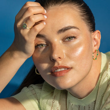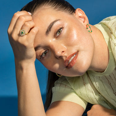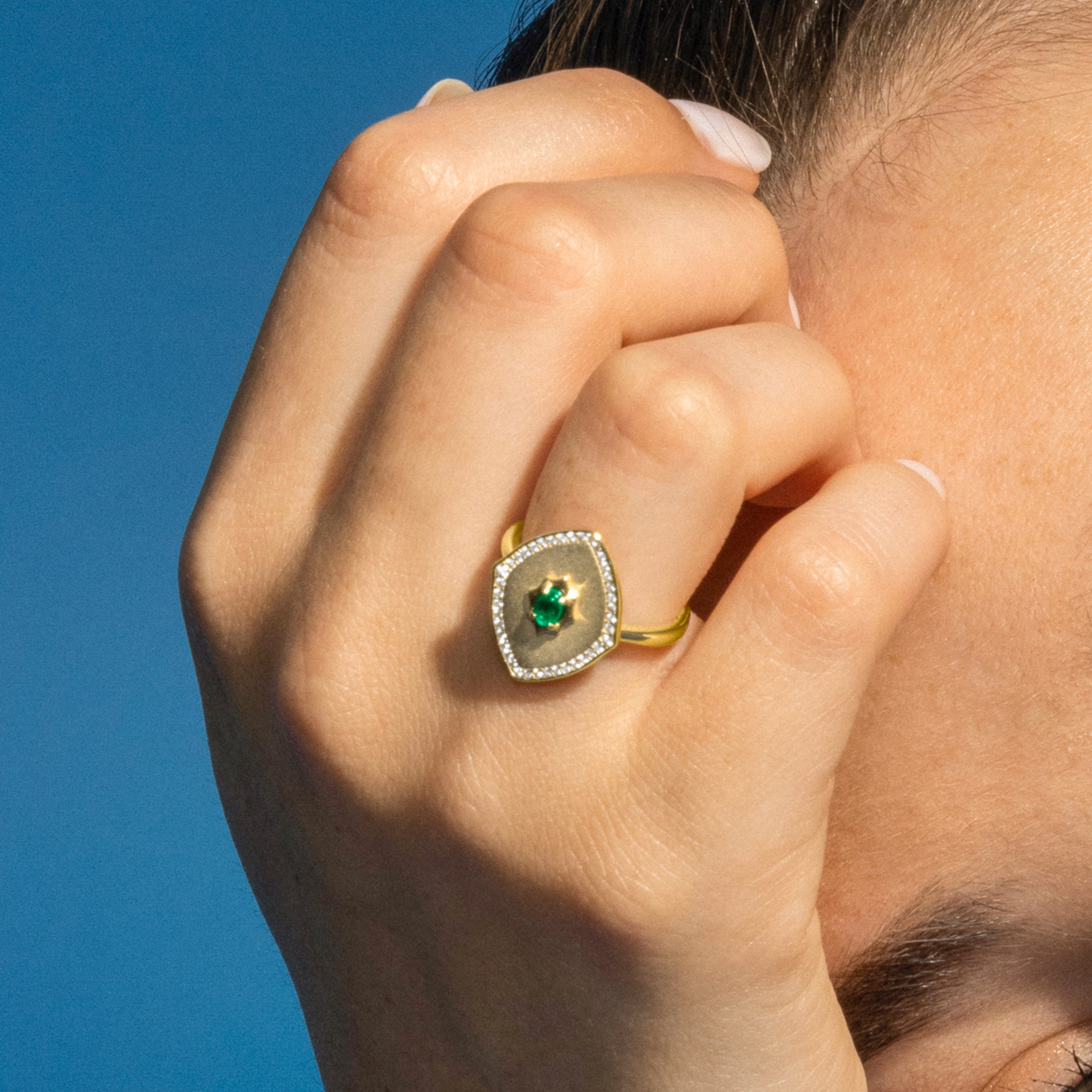 Anillo Emxy de Plata de Ley 925 y Circonita Esmeralda acabado oro 18k. Trendy representa las tendencias clave en el mundo de la moda. Nuestra línea más espontanea, con un marcado espíritu moderno que concentra en joyas repletas de color entre las que destaca el uso de piedras naturales y diseños en forma de amuletos y talismanes.