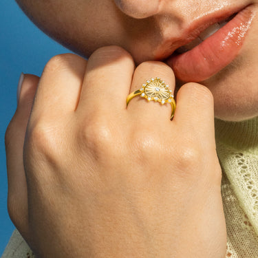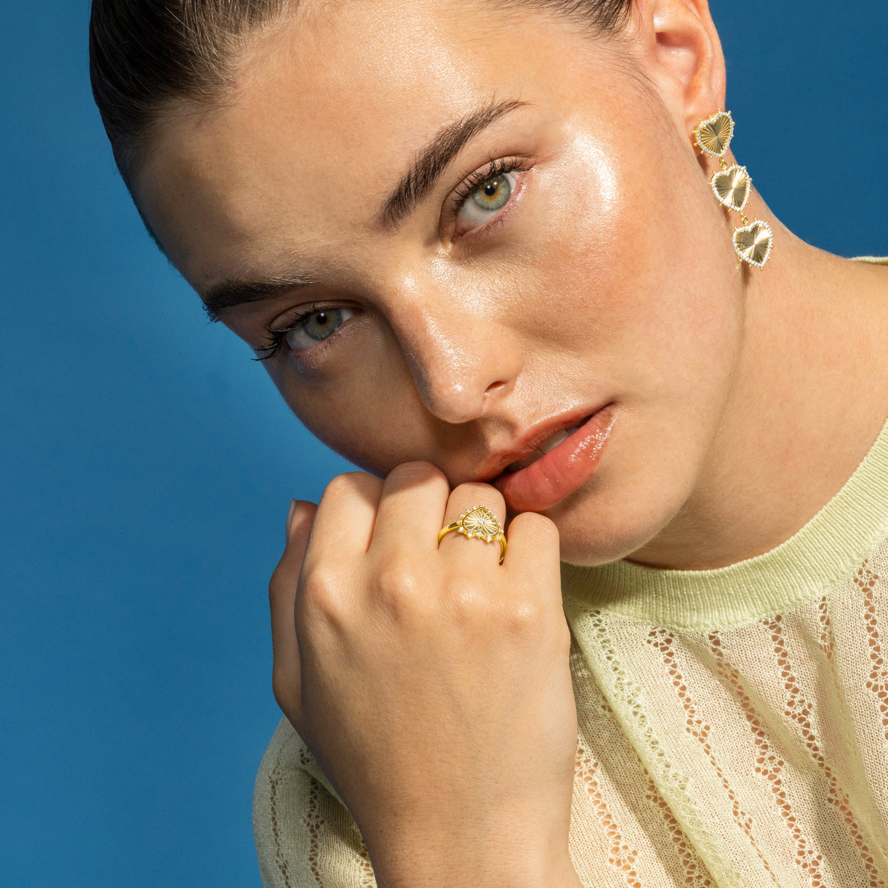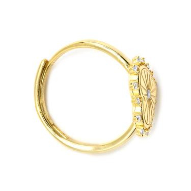 Anillo Nimed de Plata de Ley 925 y Circonita Brillante acabado oro 18k. Trendy representa las tendencias clave en el mundo de la moda. Nuestra línea más espontanea, con un marcado espíritu moderno que concentra en joyas repletas de color entre las que destaca el uso de piedras naturales y diseños en forma de amuletos y talismanes.