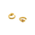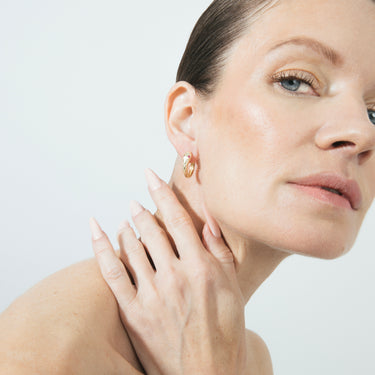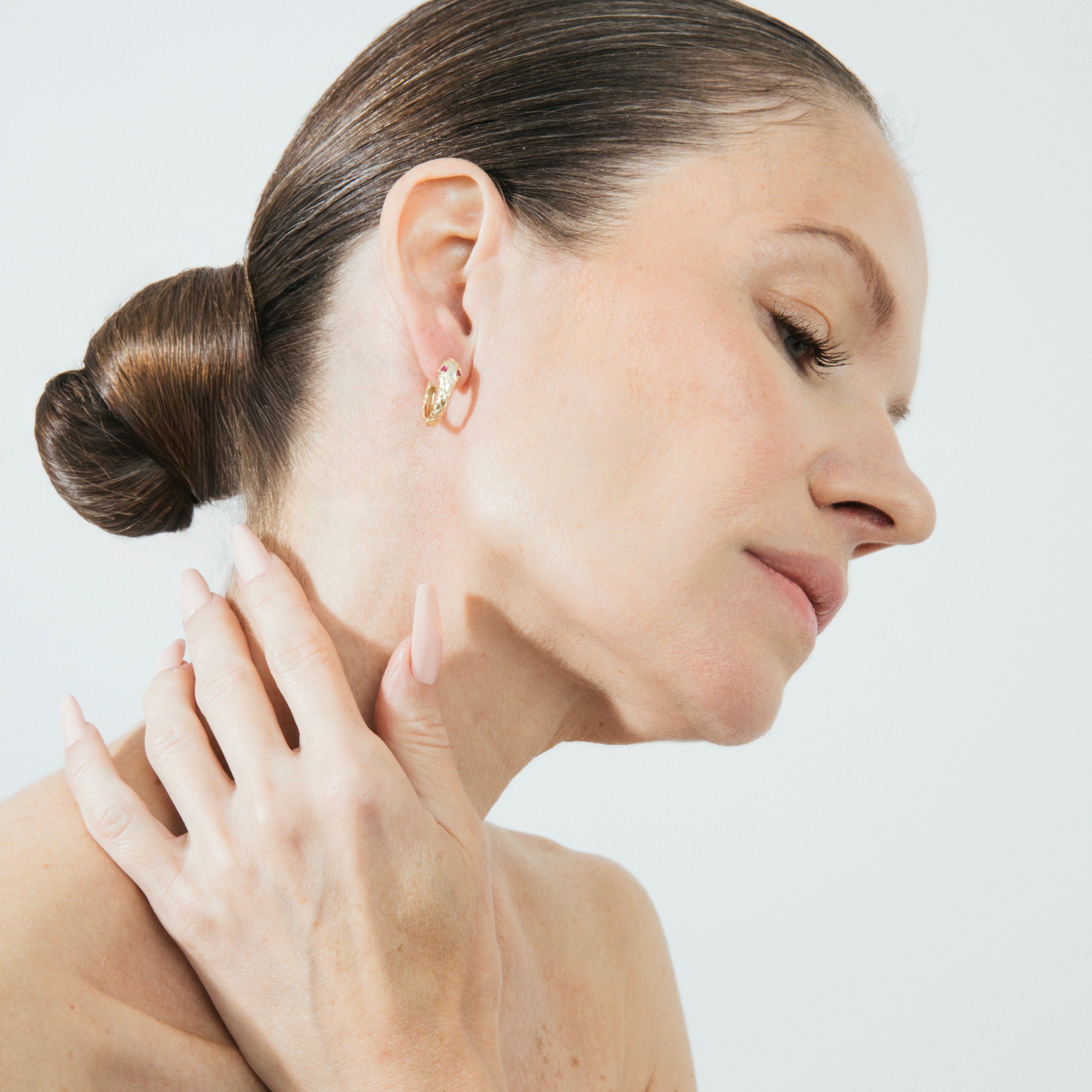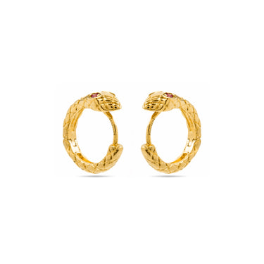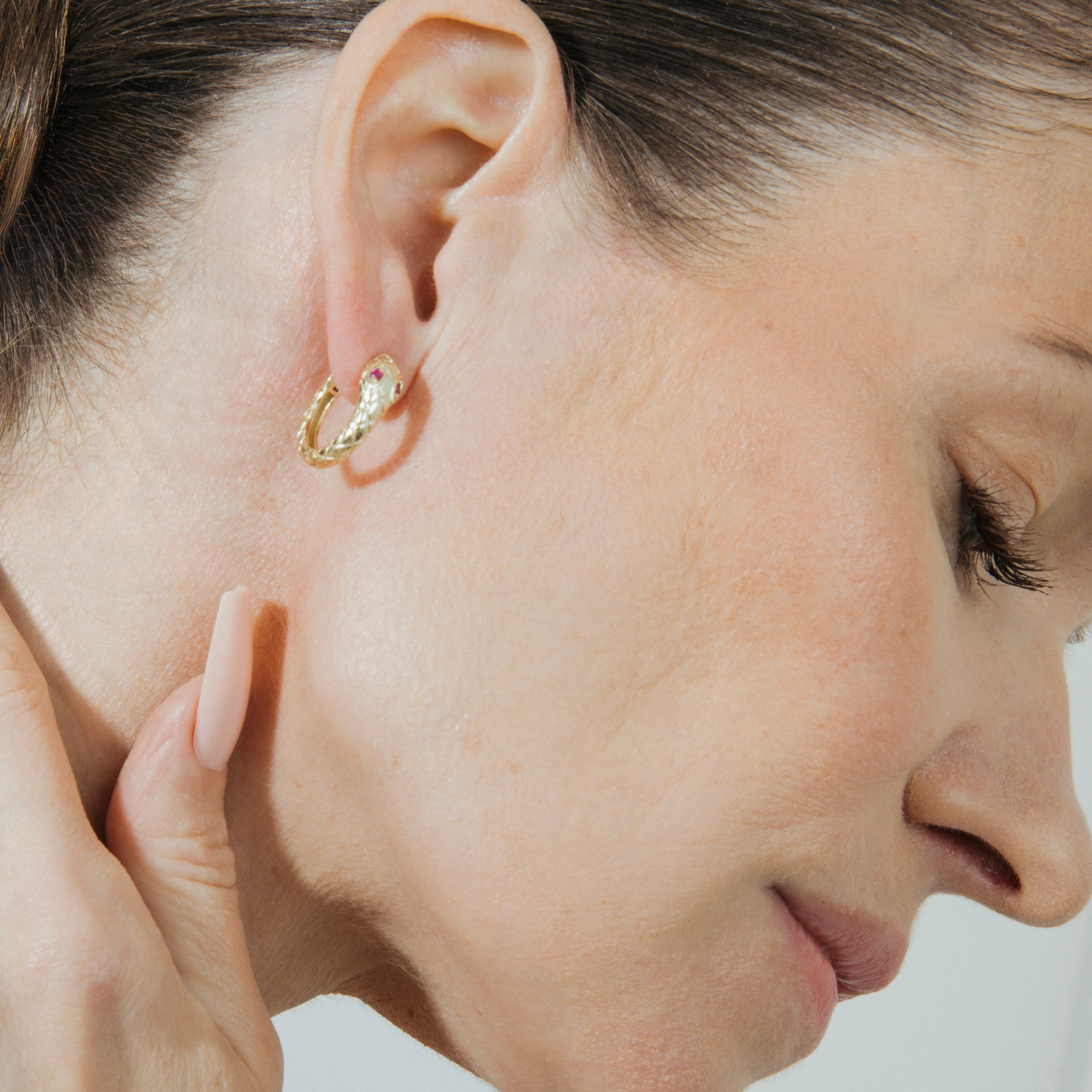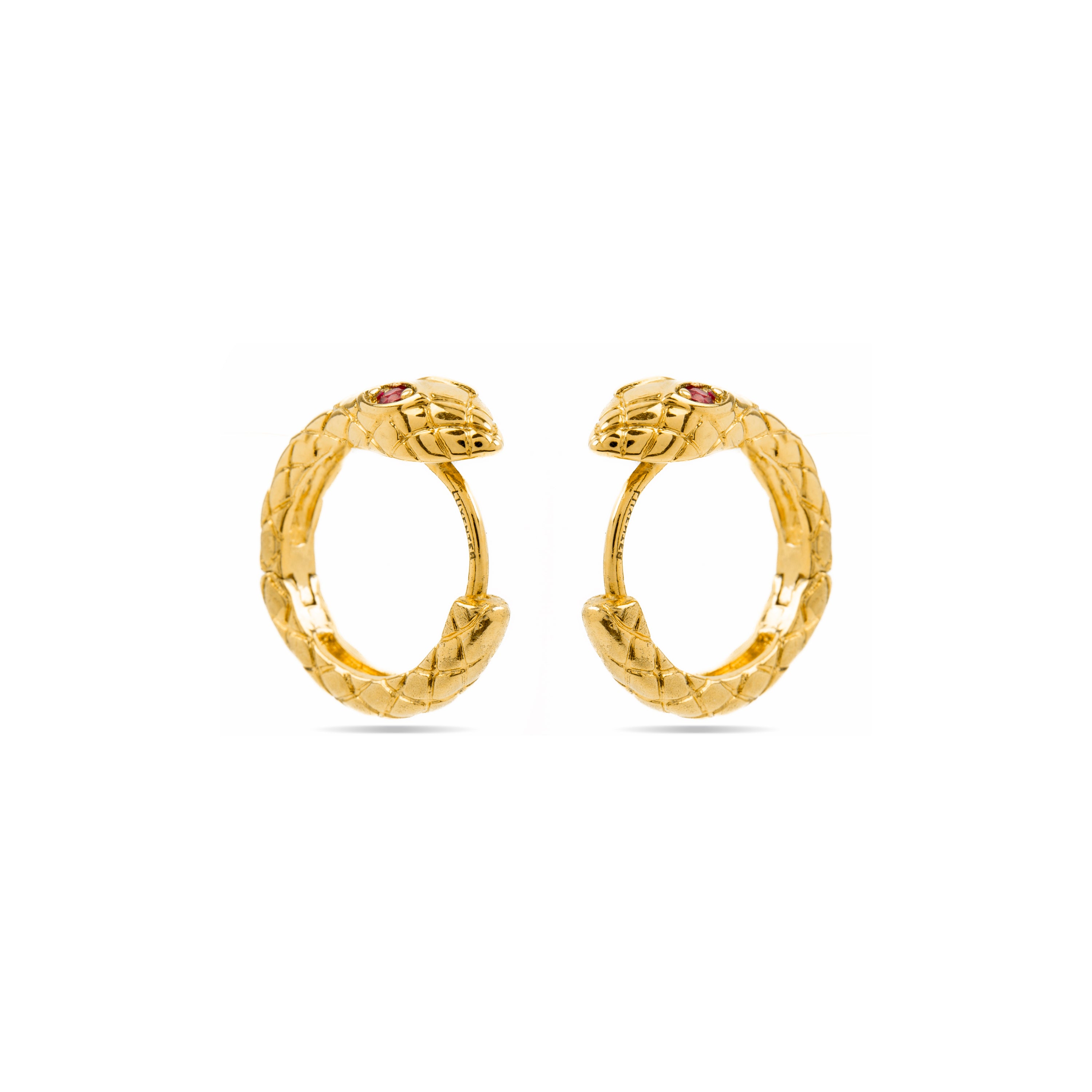 Pendientes Madsi con Circonita Rubí acabado en oro amarillo de 18K. África Basic encarna la sencillez refinada, piezas atemporales con líneas suaves y el brillo adicional de las circonitas. Joyas básicas sin pretensiones que son perfectas para el uso diario, pero también pueden funcionar en ocasiones especiales.