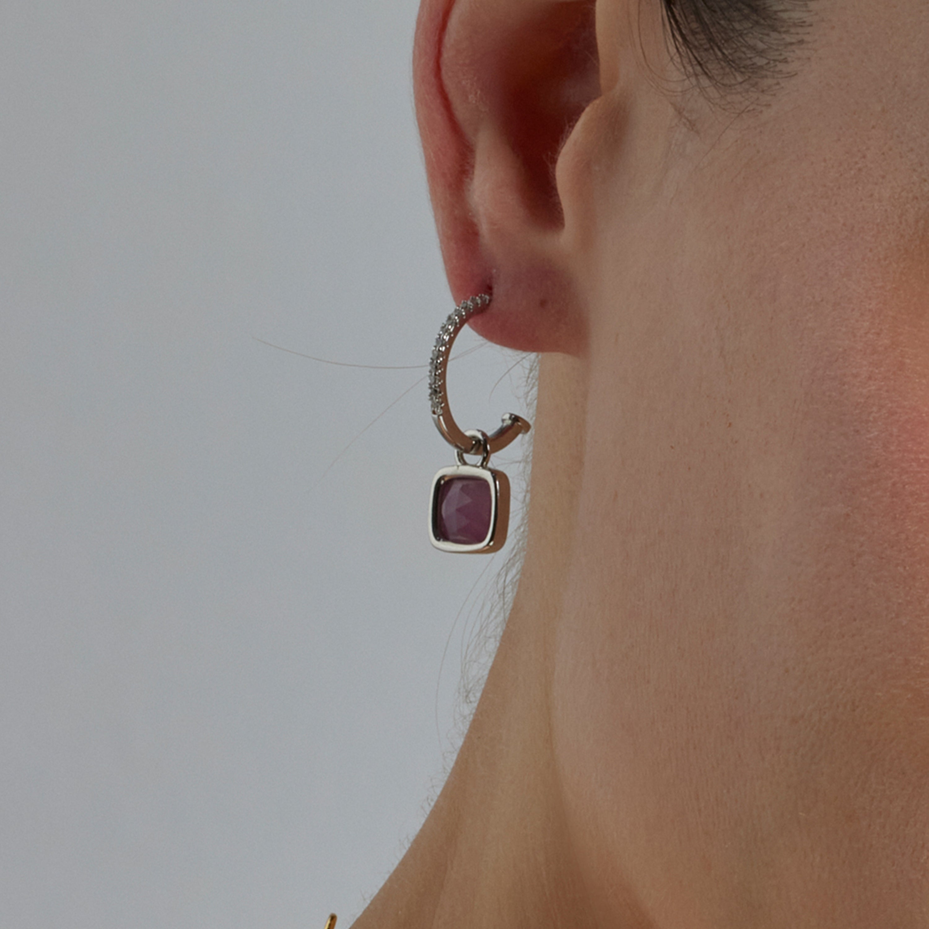 Pendientes Ourhis con Cristal Morado acabado en oro amarillo de 18K. África Basic encarna la sencillez refinada, piezas atemporales con líneas suaves y el brillo adicional de las circonitas. Joyas básicas sin pretensiones que son perfectas para el uso diario, pero también pueden funcionar en ocasiones especiales.