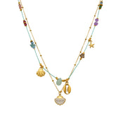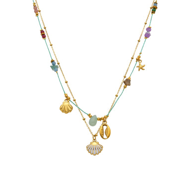 Halskette Kerad mit mehrfarbigem Kristall, 18 Karat Gold-Finish. Der Boho-Stil ist eine ästhetische Ausdrucksform des freien Geistes, die verschiedene Kulturen und künstlerische Ausdrucksformen in einem eklektischen Stil mischt, mit einem Schwerpunkt auf organischen Elementen und der Natur.