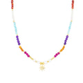 Halskette aus 925er Sterlingsilber und mehrfarbigem Kristall mit einer Vergoldung aus 18 Karat Gelbgold. Trendy repräsentiert die Schlüsseltrends in der Modewelt. Unsere spontanste Linie, mit einem ausgeprägten Boho-Charakter und modernem Geist, konzentriert sich auf Schmuckstücke voller Farbe, bei denen der Einsatz von Natursteinen und Designs in Form von Amuletten und Talismane hervorsticht.