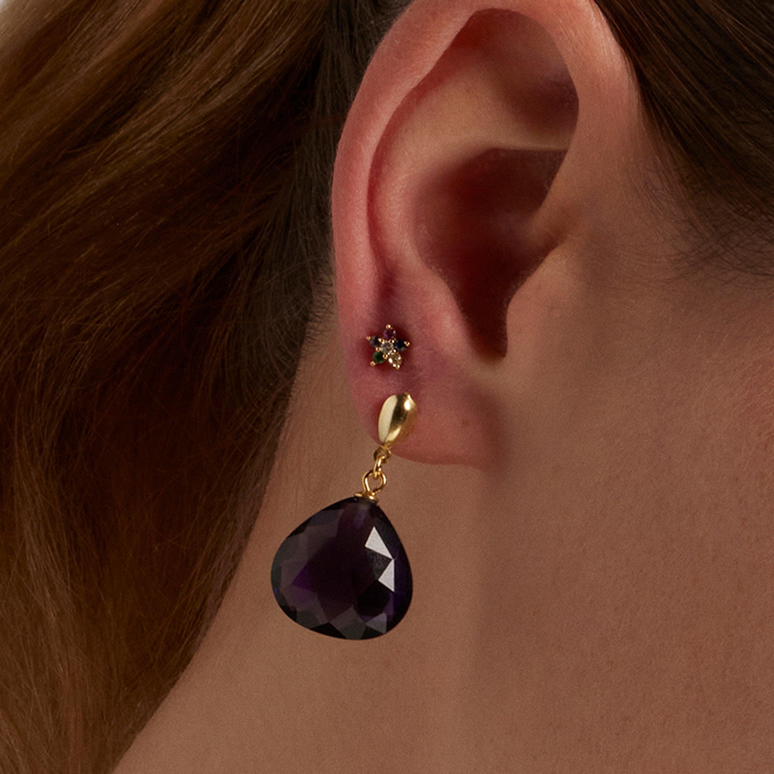 Einzelner Ohrring. Piercing dekthy aus 925er Sterlingsilber und mehrfarbigen Zirkonien mit einer Vergoldung aus 18-karätigem Gelbgold. Schmuck mit übertriebenen Designs, bei denen "das" Piercing, Kletterer, Ear Cuff und Ear Jacket die Protagonisten sind. Zarte Designs geben den Namen EARRINGS. Sorgfältig gefertigte und von Hand polierte Ohrringe, die perfekte Formen mit unendlichen Kombinationen von farbigen Zirkonien, die in Rhodium, 18-karätigem Gelbgold und Roségold über 925er Silber beschichtet sind, schaffen.