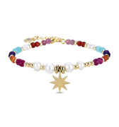 "Shasha-Armband aus 925er Sterlingsilber und mehrfarbigem Kristall mit einer Vergoldung aus 18 Karat Gelbgold. Trendy repräsentiert die Schlüsseltrends in der Modewelt. Unsere spontanste Linie, mit einem ausgeprägten Boho-Charakter und modernem Geist, konzentriert sich auf Schmuckstücke voller Farbe, bei denen der Einsatz von Natursteinen und Designs in Form von Amuletten und Talismane hervorsticht."