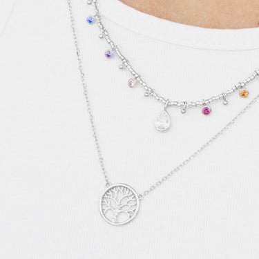 "Collier Baum des Lebens aus 925er Sterlingsilber und funkelndem Zirkonia mit Rhodium-Finish. Wünsche dir etwas! Es zeichnet sich durch junge, bedeutungsvolle und farbenfrohe Designs aus, die gleichzeitig originell und dezent sind und darauf abzielen, kleine Amulette zu werden."