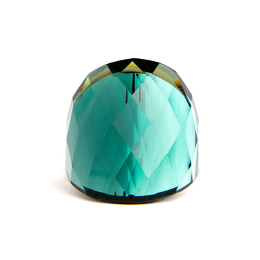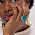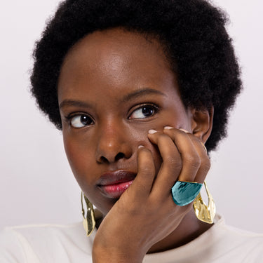 Metallring Konsil mit grünem hydrothermalem Quarz, vergoldet mit 18K Gelbgold. Afrika wird zur perfekten Linie für Frauen mit Persönlichkeit, die keine Angst haben, Risiken einzugehen und Stücke mit eigenem Charakter zu tragen.