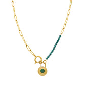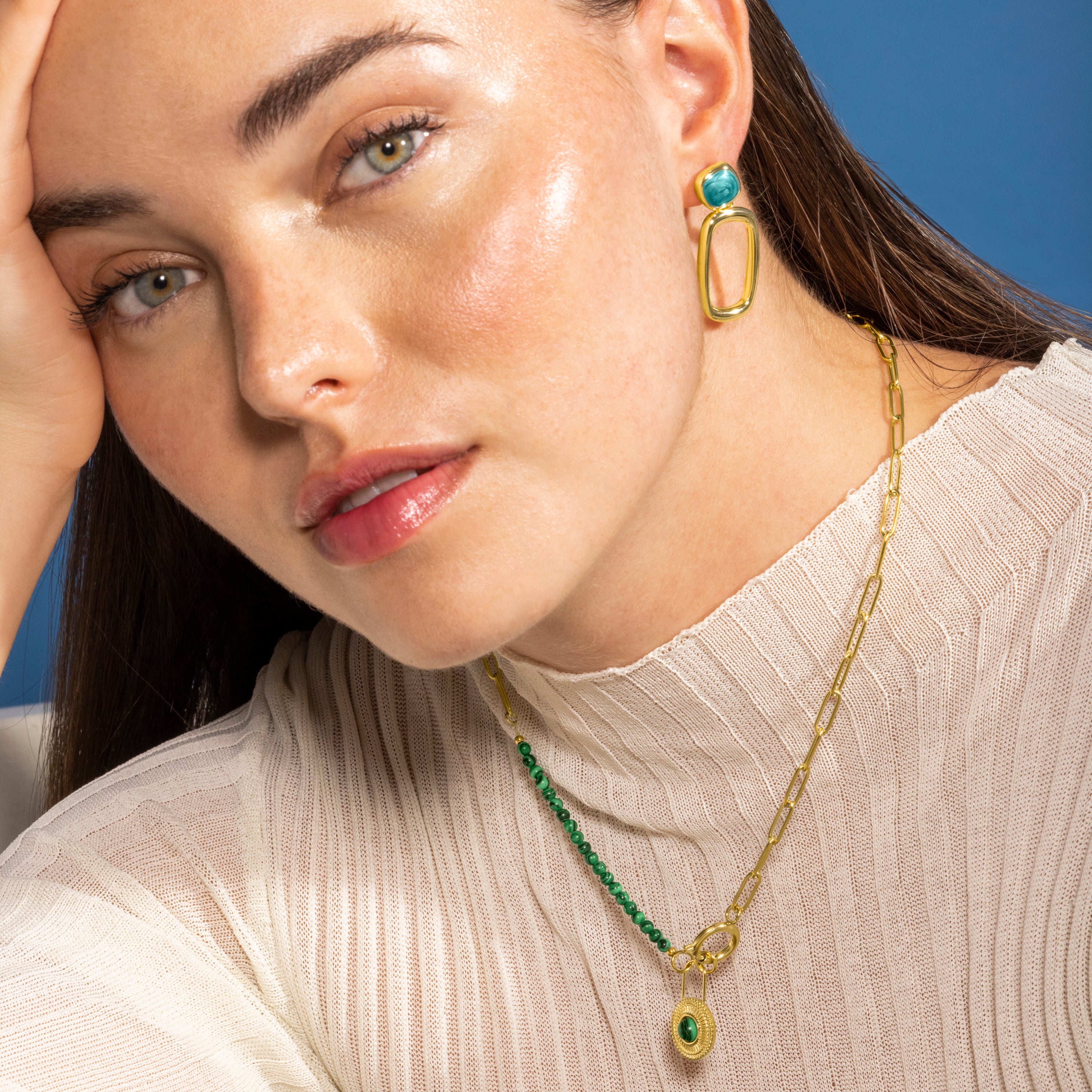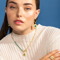"Mossir Halskette aus Malachit mit 18K Gelbgold-Finish. Afrika wird zur perfekten Linie für Frauen mit Persönlichkeit, die keine Angst haben, Risiken einzugehen und Stücke mit eigenem Charakter zu tragen."