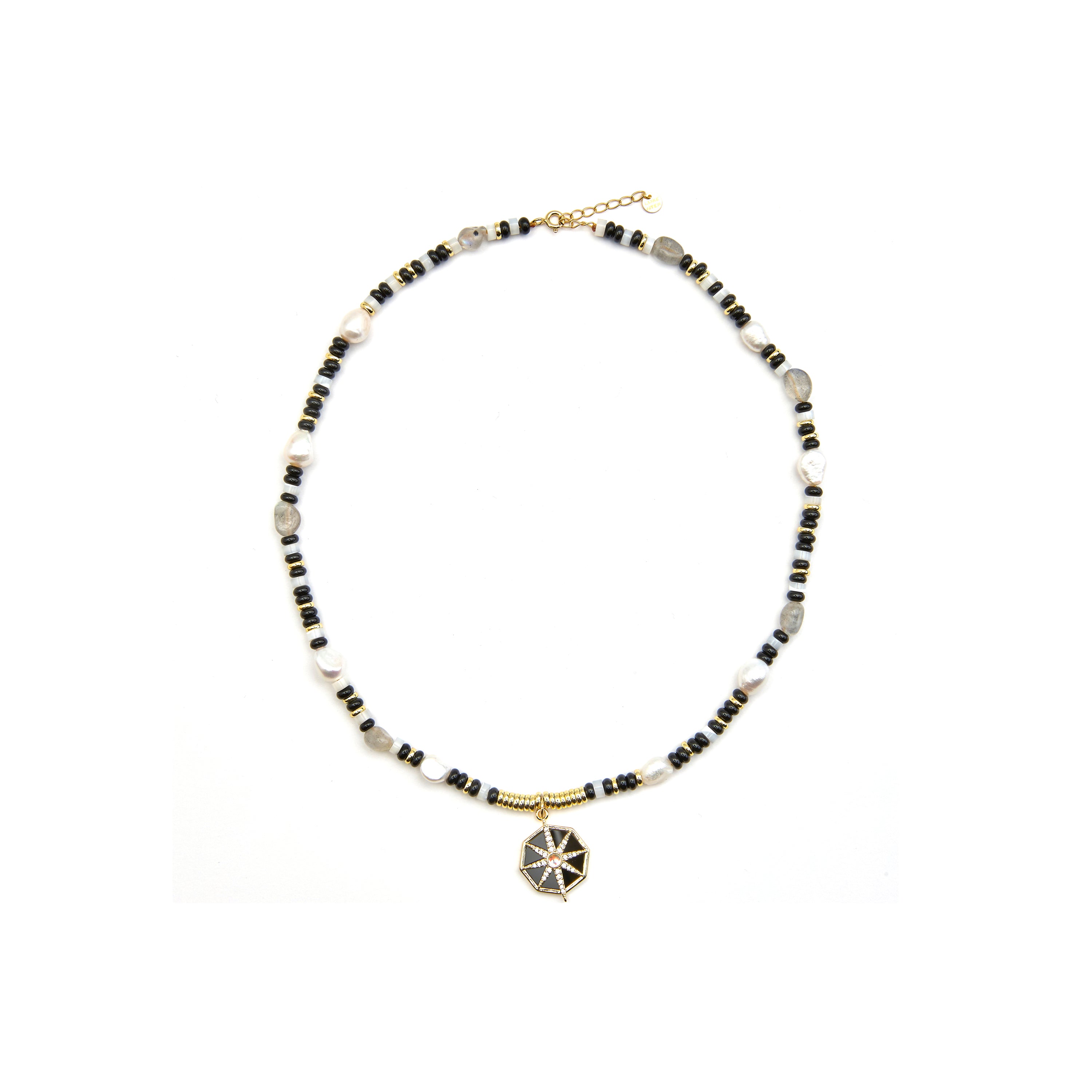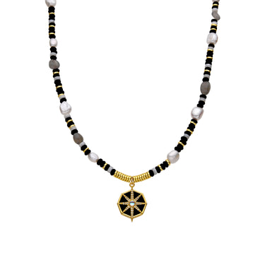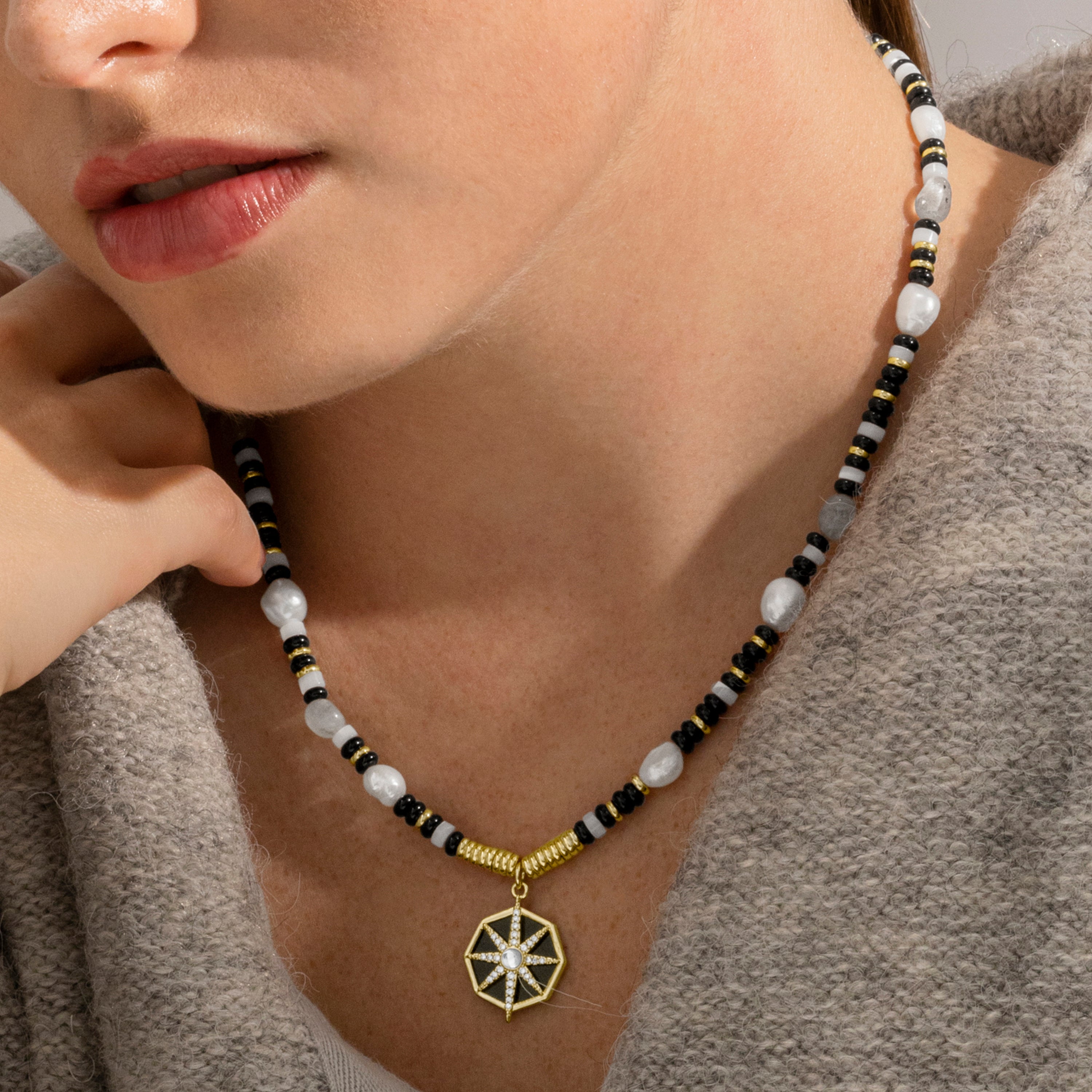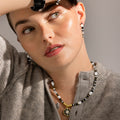 "Collar Nanys aus 925er Sterlingsilber, Perlen und Anhänger aus Metall und Onyx mit 18k Goldfinish. Trendy repräsentiert die Schlüsseltrends in der Modewelt. Unsere spontanste Linie, mit einem ausgeprägten modernen Geist, die sich auf Schmuck konzentriert, der voller Farbe ist, wobei der Einsatz von Natursteinen und Designs in Form von Amuletten und Talismane hervorsticht."