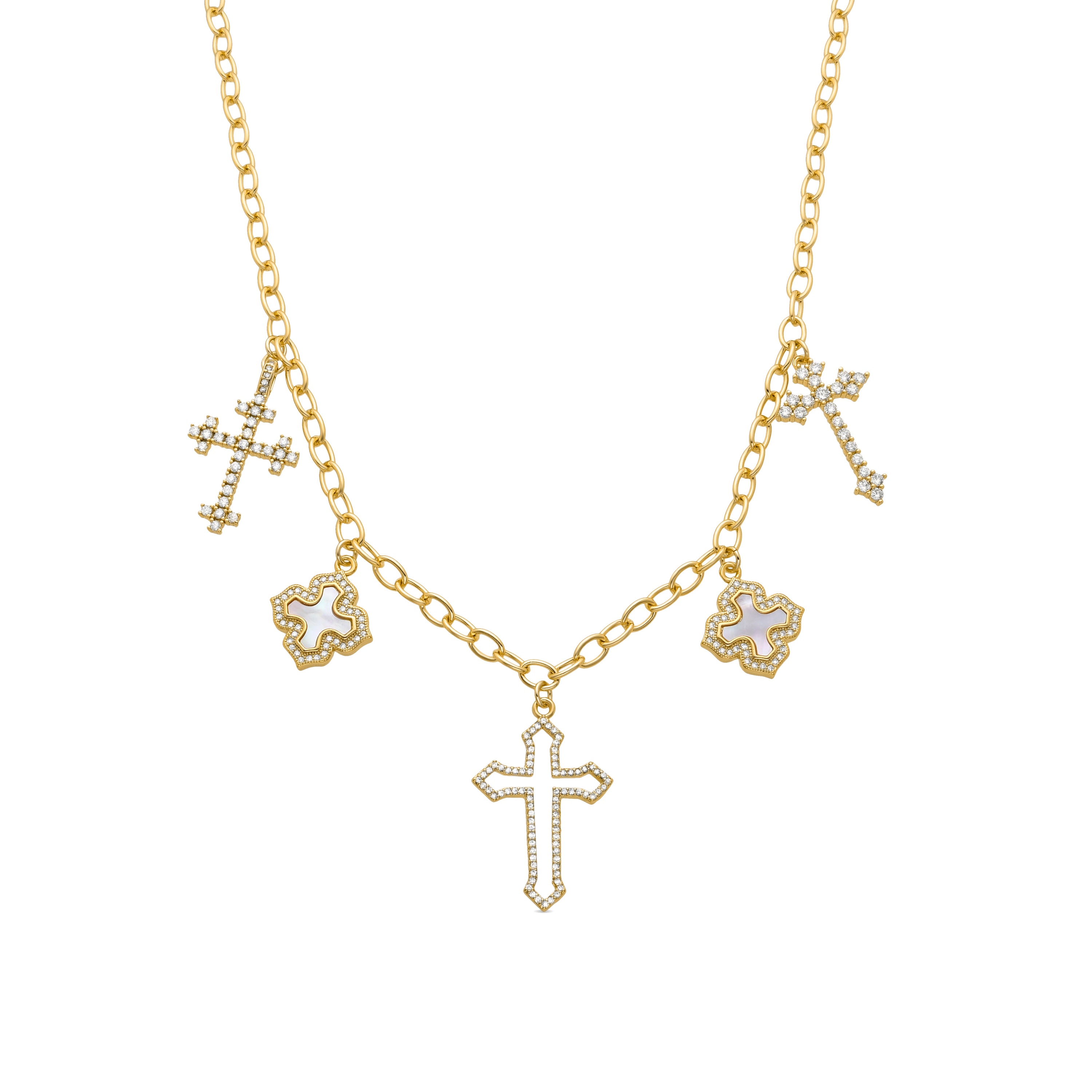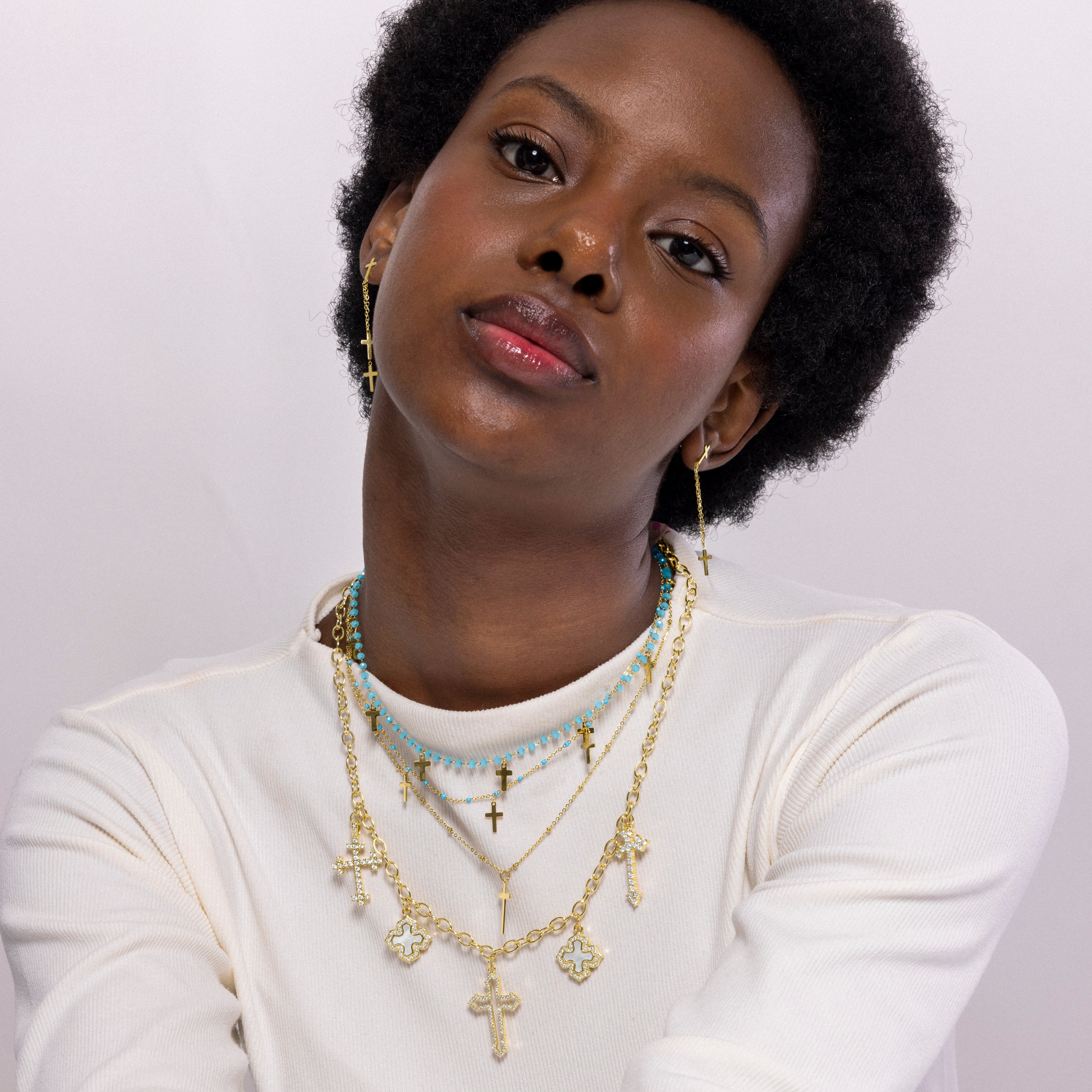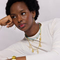 Halskette aus Metall Lysay mit glänzenden Zirkonia, vergoldet mit 18k Gelbgold. Der Boho-Stil ist eine Ästhetik des freien Geistes, die verschiedene Kulturen und künstlerische Ausdrucksformen in einem eklektischen Stil mischt, mit einem Schwerpunkt auf organischen Elementen und der Natur.