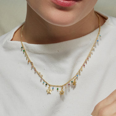 Halskette Sesse aus Metall, Kette und Verschluss aus Silber und mehrfarbigem Kristall, veredelt mit 18-karätigem Gelbgold. Trendy repräsentiert die Schlüsseltrends in der Modewelt. Unsere spontanste Linie, mit einem ausgeprägten Boho-Charakter und modernem Geist, konzentriert sich auf Schmuckstücke voller Farbe, bei denen der Einsatz von Natursteinen und Designs in Form von Amuletten und Talismane hervorsticht.