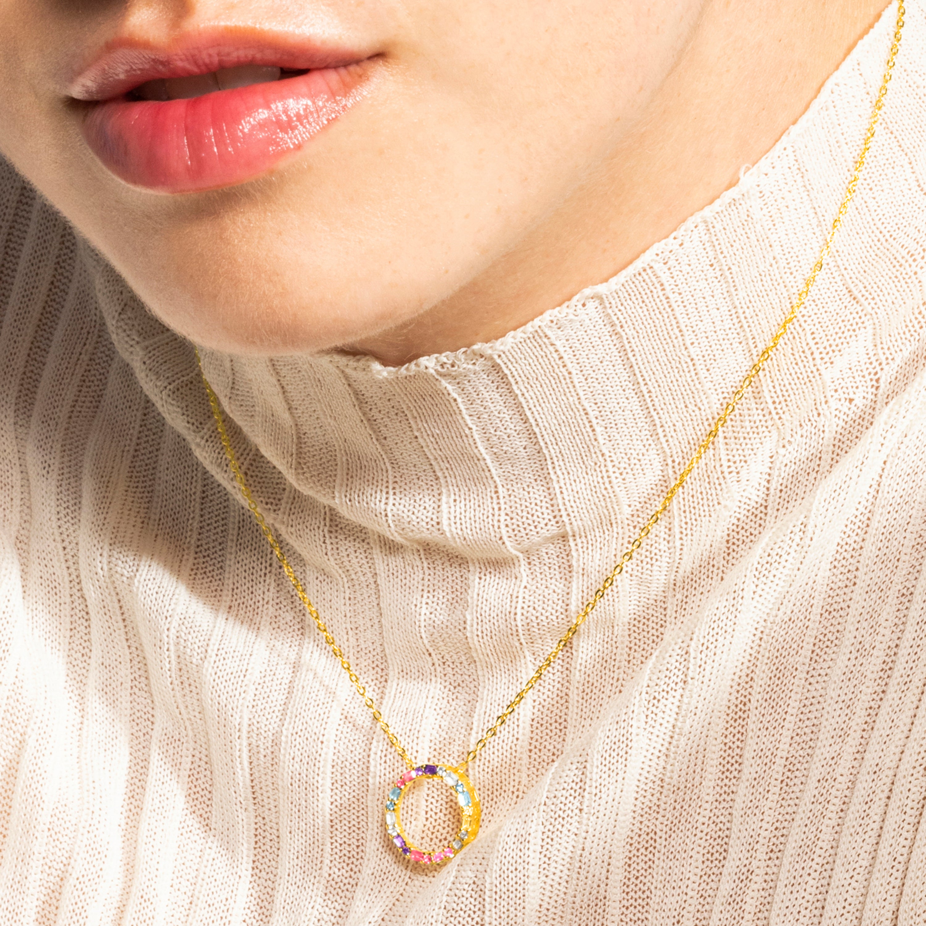 Halskette Hrius aus 925er Sterlingsilber und mehrfarbigen Zirkonia mit 18k Goldfinish. Trendy repräsentiert die Schlüsseltrends in der Modewelt. Unsere spontanste Linie, mit einem ausgeprägten modernen Geist, der sich in farbenfrohen Schmuckstücken widerspiegelt, in denen der Einsatz von Natursteinen und Designs in Form von Amuletten und Talismane hervorsticht.