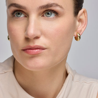 Ohrringe Rakhon in 18k Gold. Essential verkörpert die raffinierte Schlichtheit, zeitlose Stücke mit sanften Linien und dem zusätzlichen Glanz von Zirkonia. Unaufdringliche Basics, die perfekt für den täglichen Gebrauch sind, aber auch bei besonderen Anlässen funktionieren können.