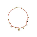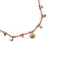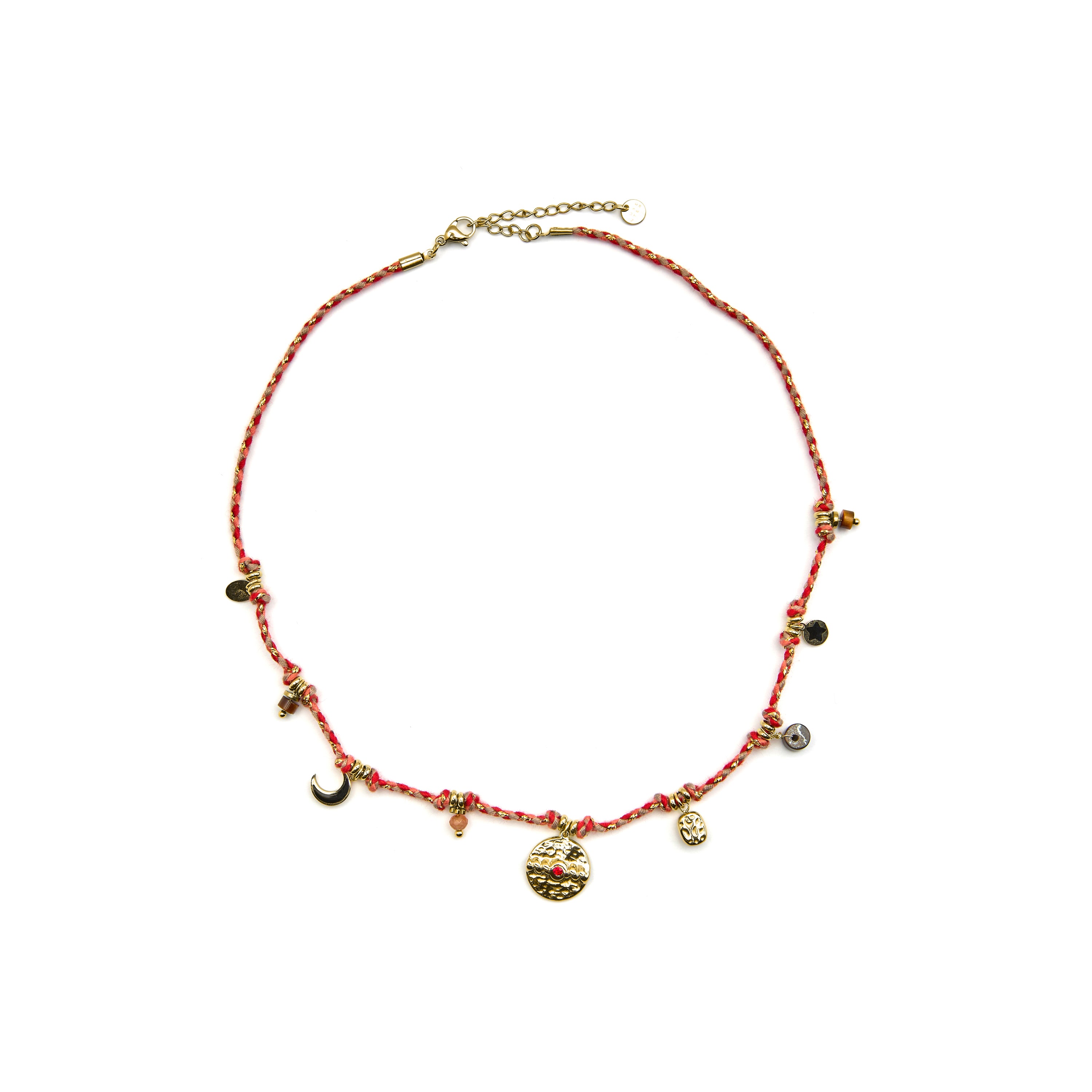 Halskette aus Stahl Liskel mit rotem Kristall, vergoldet mit 18 Karat. Der Boho-Stil ist eine Ästhetik des freien Geistes, die verschiedene Kulturen und künstlerische Ausdrucksformen in einem eklektischen Stil mischt, mit einem Schwerpunkt auf organischen Elementen und der Natur.