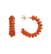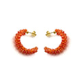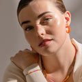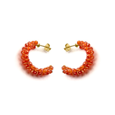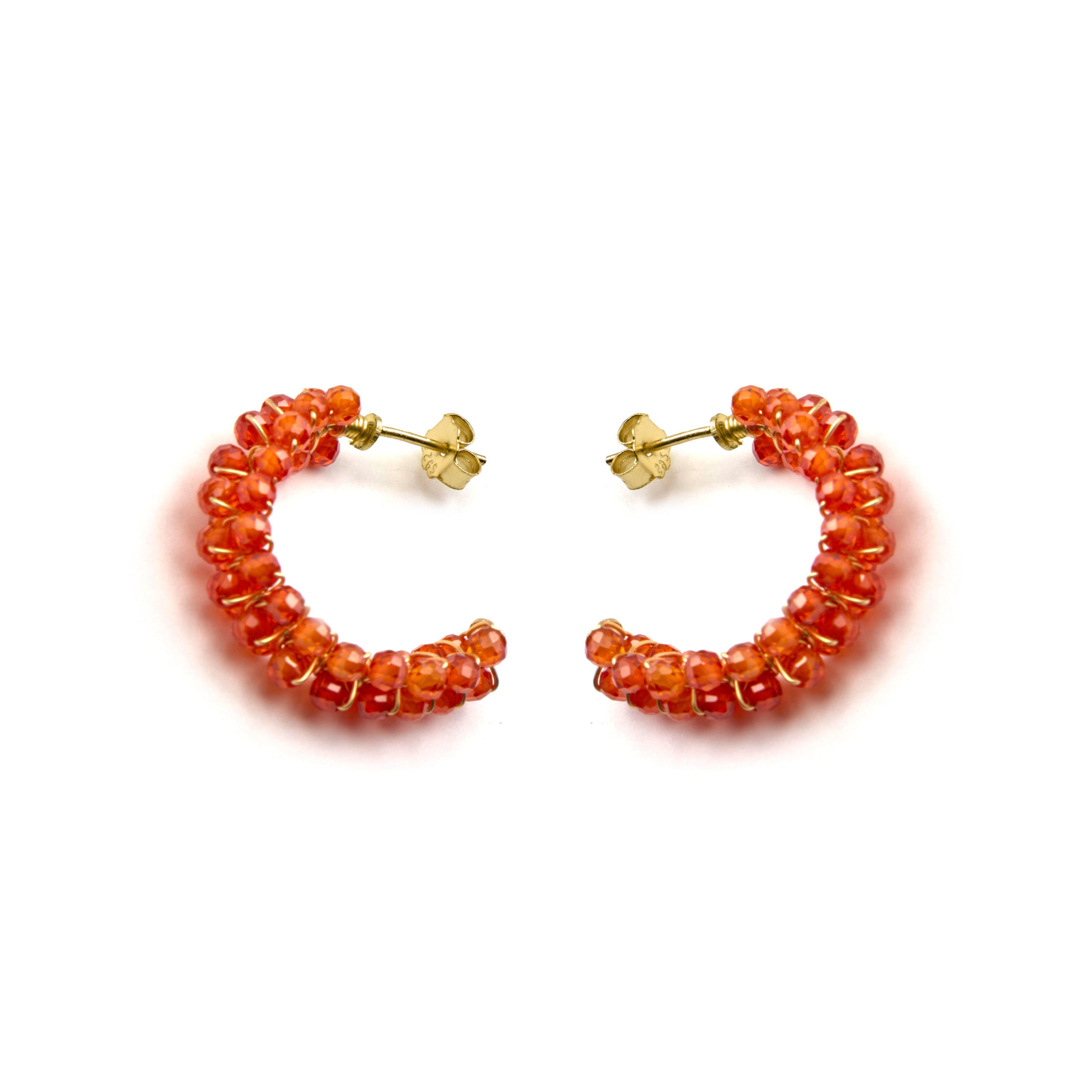 "Siran earrings with 925 sterling silver closure, metal thread, and orange crystal finished in 18k gold. Trendy represents the key trends in the fashion world. Our most spontaneous line, with a marked modern spirit that focuses on jewelry filled with color, highlighting the use of natural stones and designs in the form of amulets and talismans."
