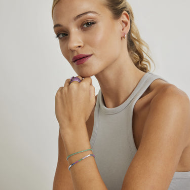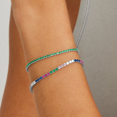 Leythor Bracelet made of 925 sterling silver and Emerald Cubic Zirconia finished in rhodium. The name of the line endorses it: ATELIER Rubi. Jewelry that surrenders to an atypical design that has placed these sensual designs in a privileged position: part of the current woman's wardrobe essentials. Designs made up of multicolored cubic zirconias that stand out as the most classic alongside those with a strong touch of green, blue, and red carefully hand-finished.