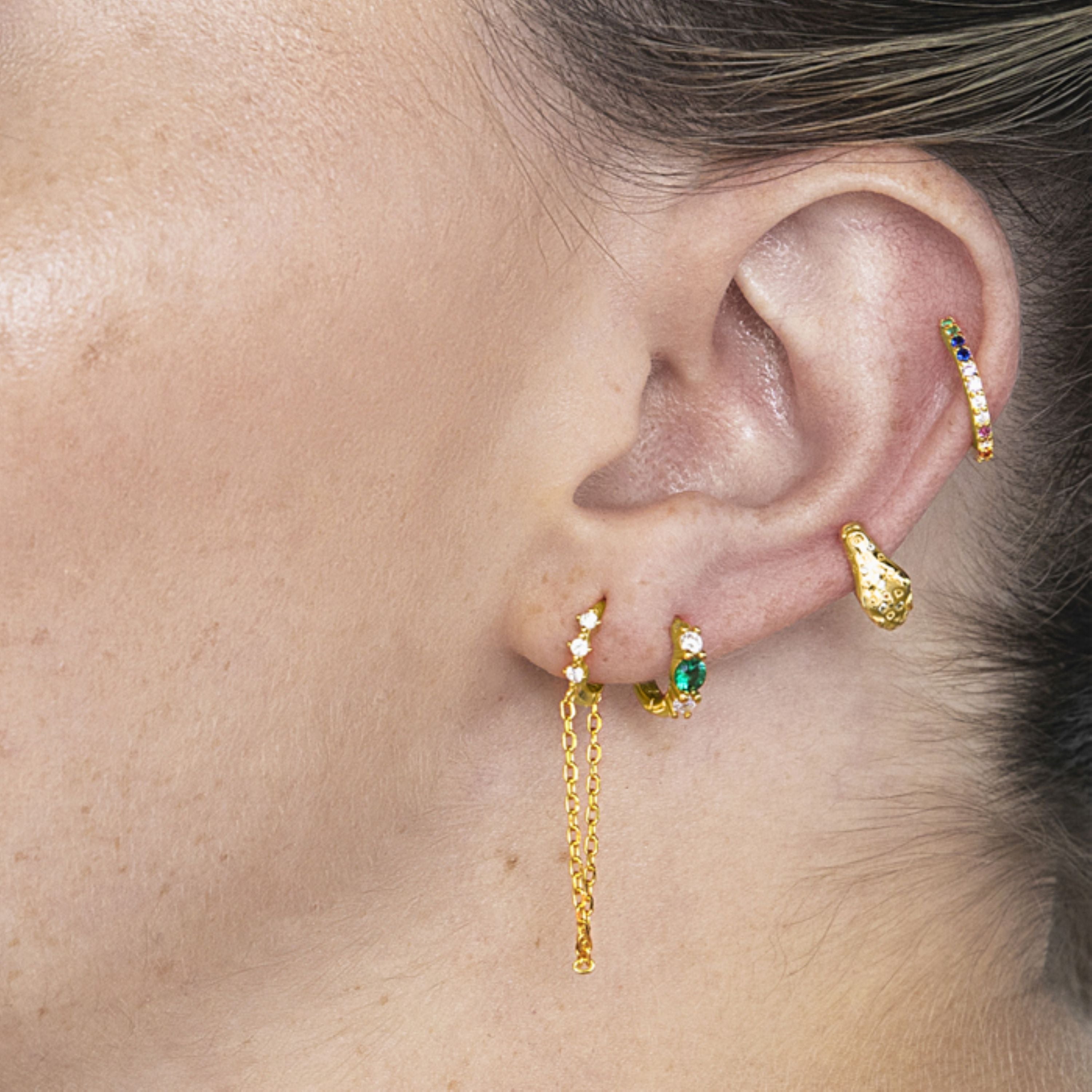 Silgren 925 Sterling Silver Earrings, Emerald Cubic Zirconia, and 18-Carat Yellow Gold Plating. Jewelry with excessive designs where piercings, climbers, ear cuffs, and ear jackets are the protagonists. Delicate designs give name to EARRINGS. Earrings carefully finished and hand-polished, creating perfect shapes with infinite combinations of colored cubic zirconias plated in rhodium, yellow gold, and 18-carat rose gold over 925 sterling silver. Just like in the 60s, everything is mixed again for a new impact for the beat generation, being the best mix of New Yorker sobriety and feminine sensuality. Designs with personality dictate the color and mother nature: the union of different materials and an exquisite arrangement of the pieces make this line the unique jewel, defining the most British side of the it girl: Relativity is (IN)herent to color.