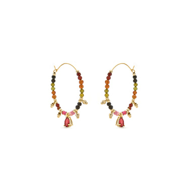 Baim multicolor tourmaline metal earrings finished in 18k yellow gold. The Boho style is a free-spirited aesthetic that blends different cultures and artistic expressions into an eclectic style with an emphasis on organic elements and nature.