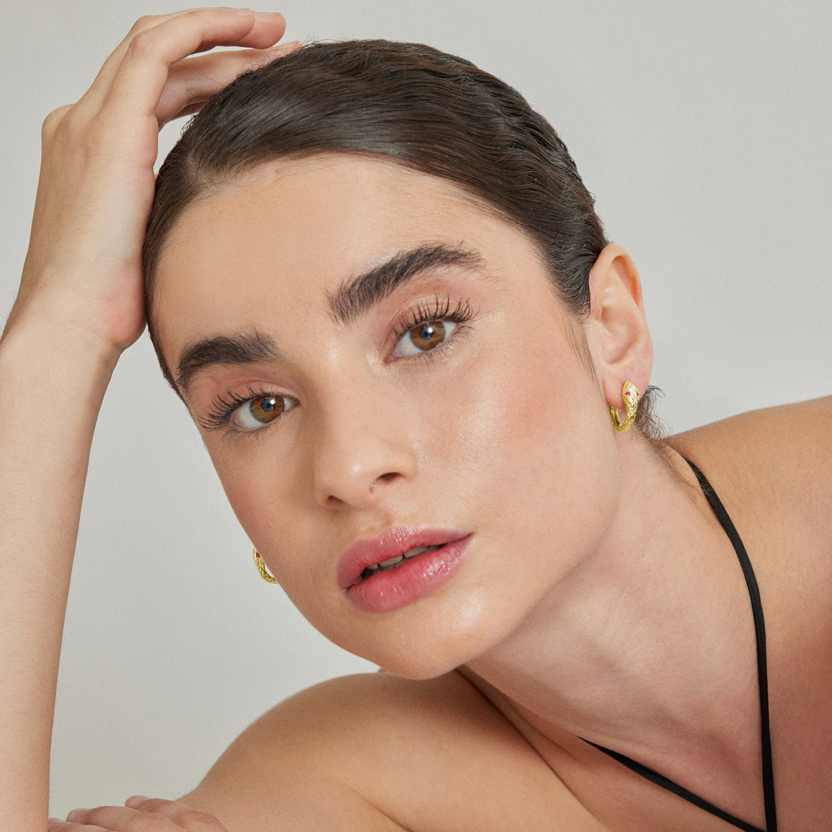 Madsi earrings with Ruby zirconia finished in 18K yellow gold. África Basic embodies refined simplicity, timeless pieces with soft lines and the added sparkle of zirconias. Unpretentious basic jewelry that is perfect for everyday wear, but can also work for special occasions.
