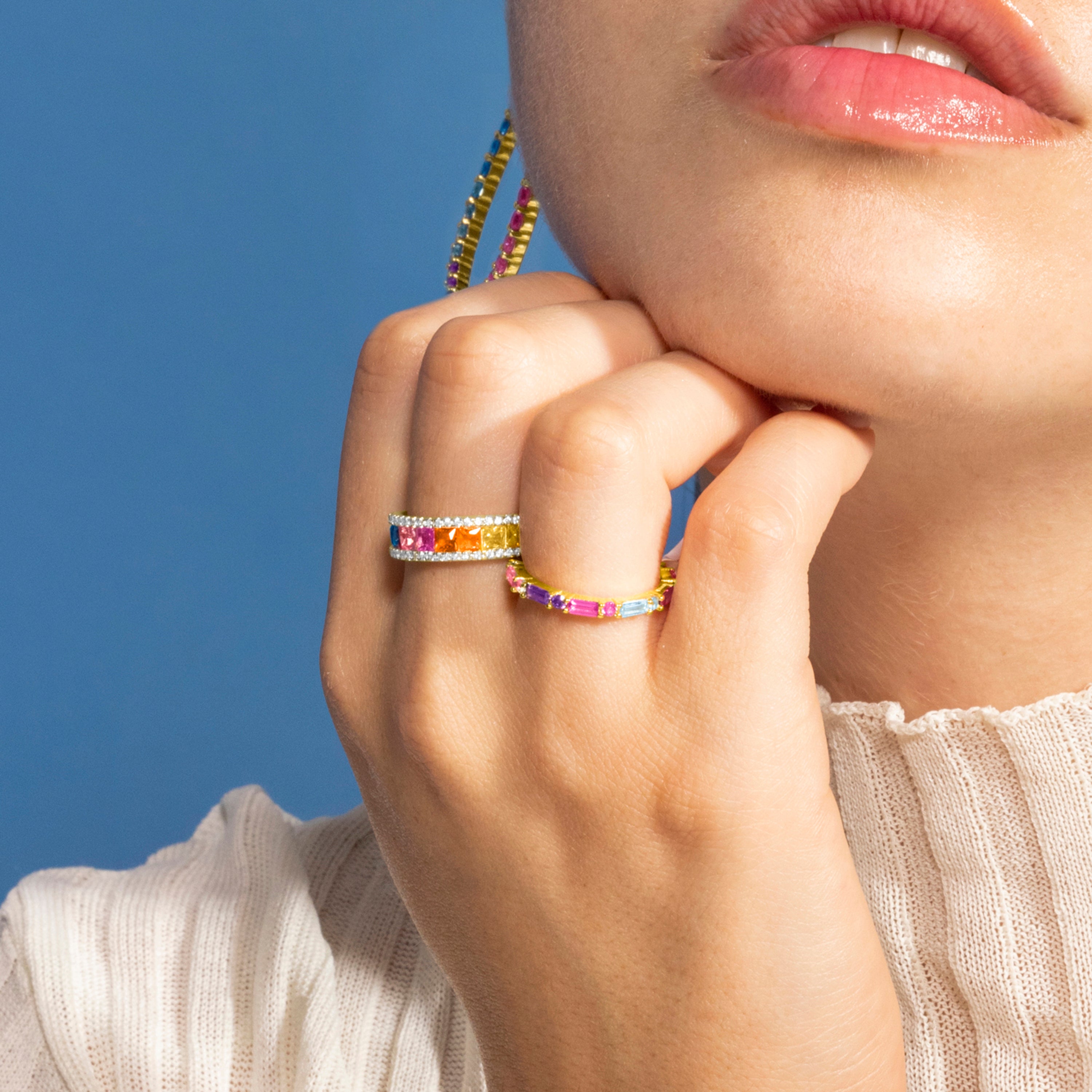 Bhaime Ring made of 925 Sterling Silver and Multicolor Cubic Zirconia with 18k gold finish. Trendy represents the key trends in the fashion world. Our most spontaneous line, with a strong modern spirit that focuses on jewelry full of color, highlighting the use of natural stones and designs in the form of amulets and talismans.