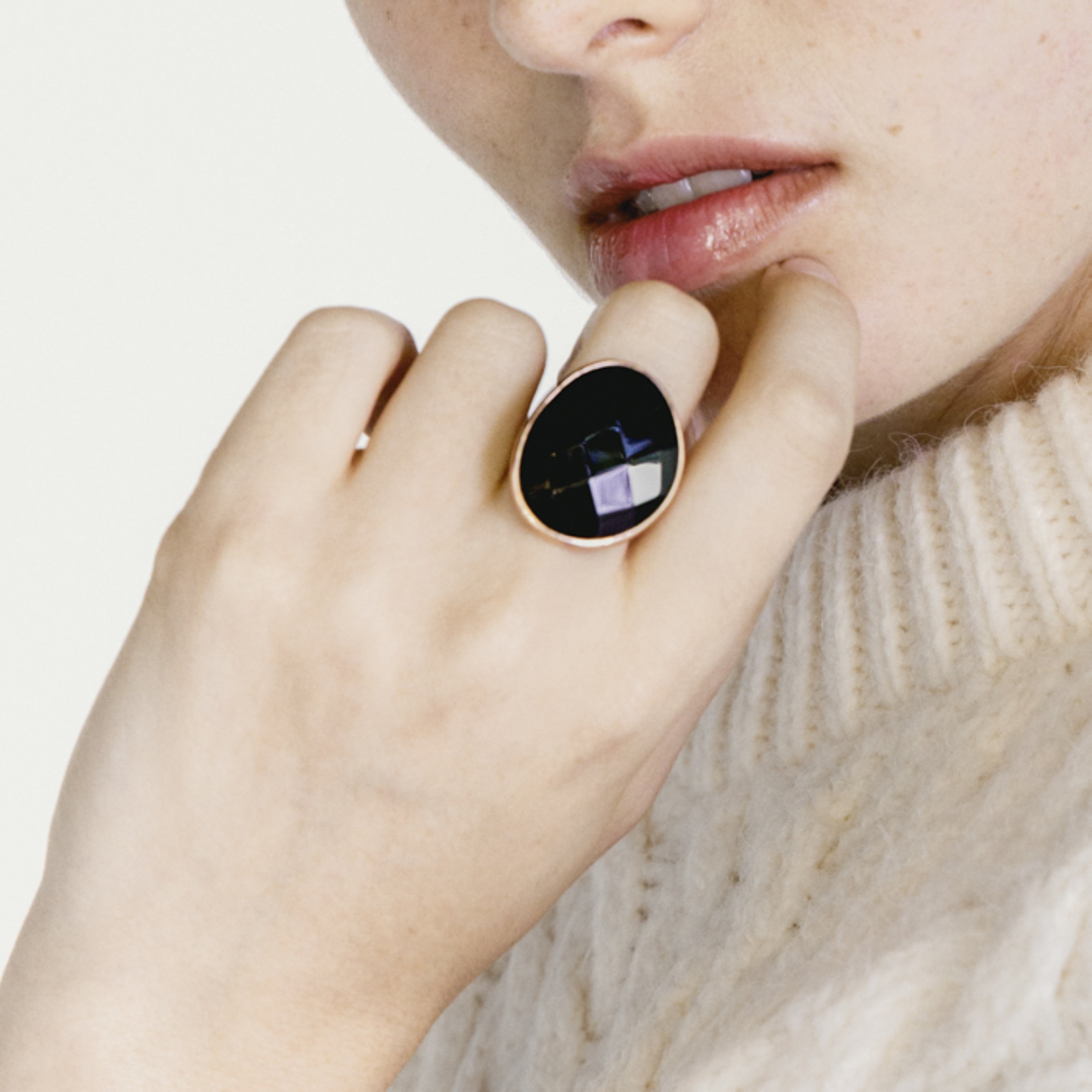 Taru Ring made of 925 sterling silver and Hydrothermal Amethyst finished in 18-carat rose gold. The name of the line speaks for itself: ATELIER Semi-Precious Stones. Jewelry that surrenders to an atypical design that has placed these sensual designs in a privileged position: becoming part of the modern woman's wardrobe. Designs with semi-precious stones: amethysts, the most classic alongside fluorites and quartz and aquamarine carefully finished by hand.