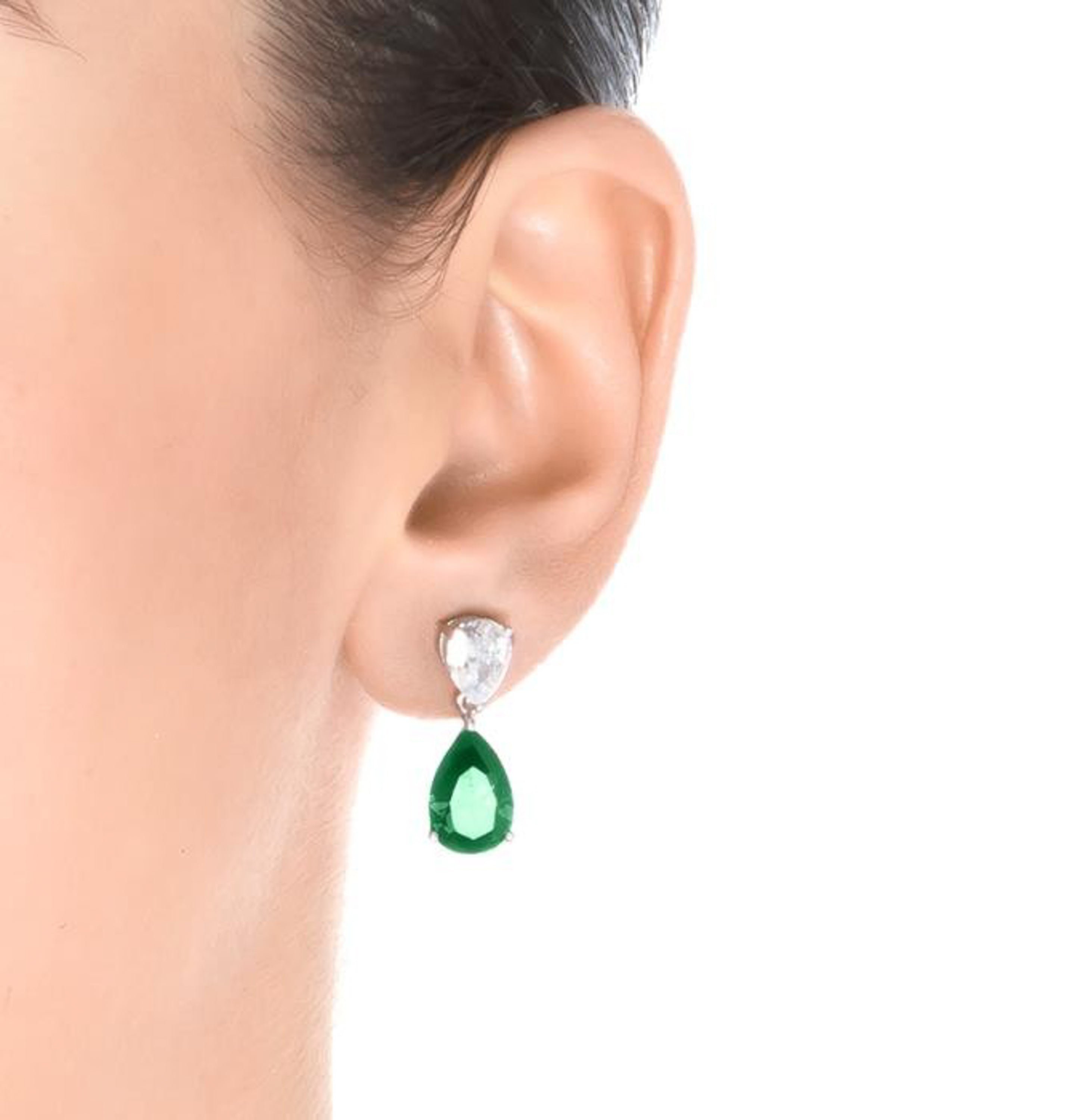 "Chenwa Earrings of Emerald Zirconia finished in rhodium. The name of the line speaks for itself: ATELIER Rubi. Jewelry that surrenders to an atypical design that has placed these sensual designs in a privileged position: becoming part of the current woman's wardrobe essentials. Designs made up of multicolored zirconias that stand out as the most classic alongside those that add a strong touch of green, blue, and red, carefully finished by hand."