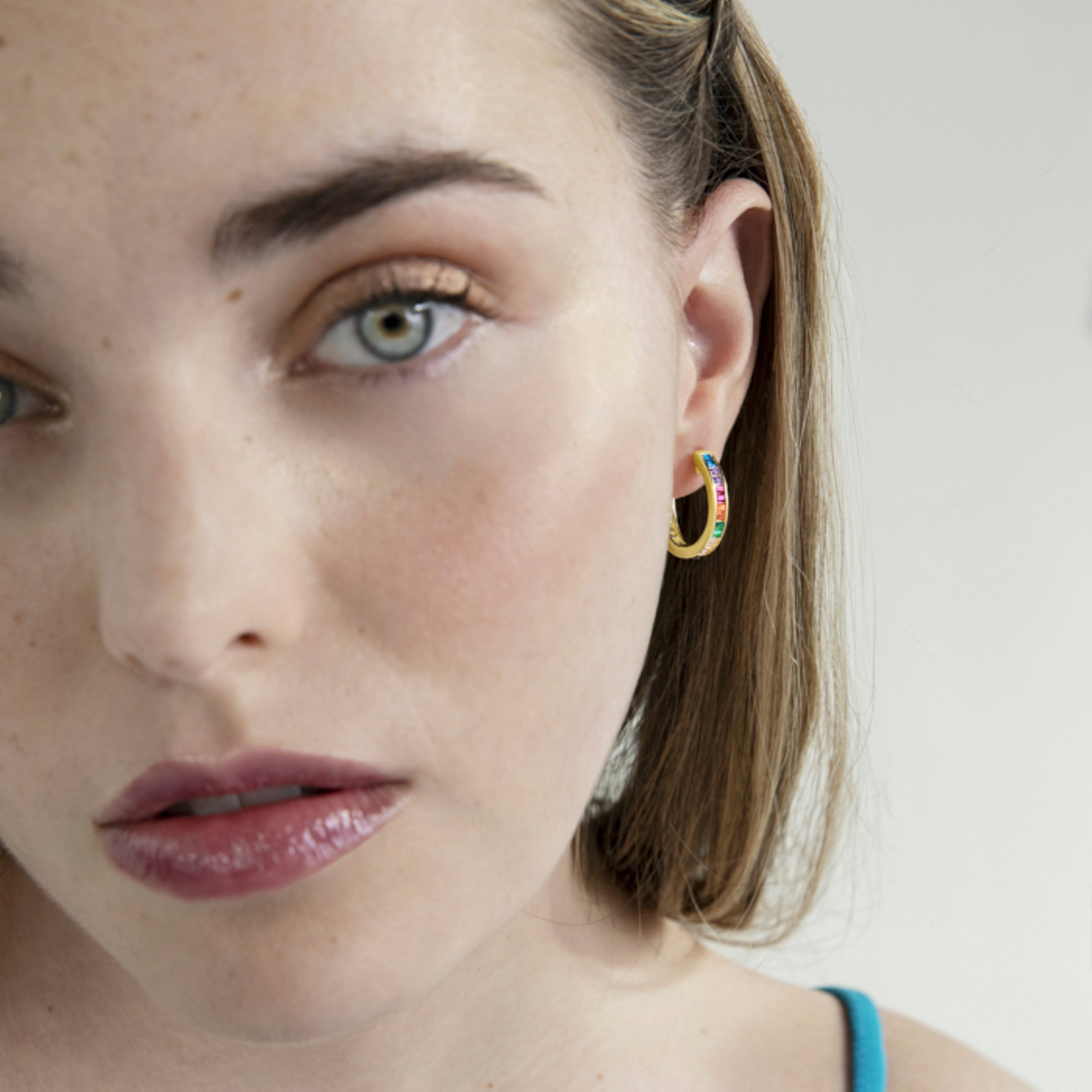 "925 sterling silver earrings with multicolor zirconia and finished with 18-carat yellow gold plating. Trendy represents the key trends in the fashion world. Our most spontaneous line, with a marked boho character and modern spirit, focuses on jewelry filled with color, highlighting the use of natural stones and designs in the form of charms and talismans."