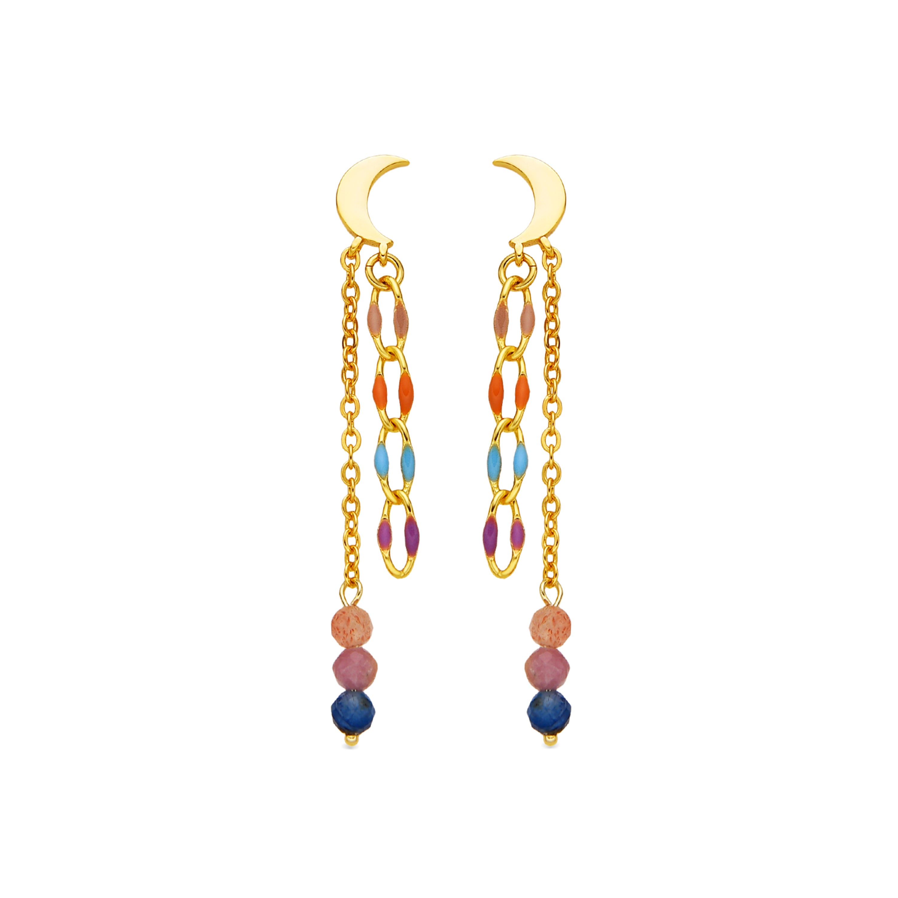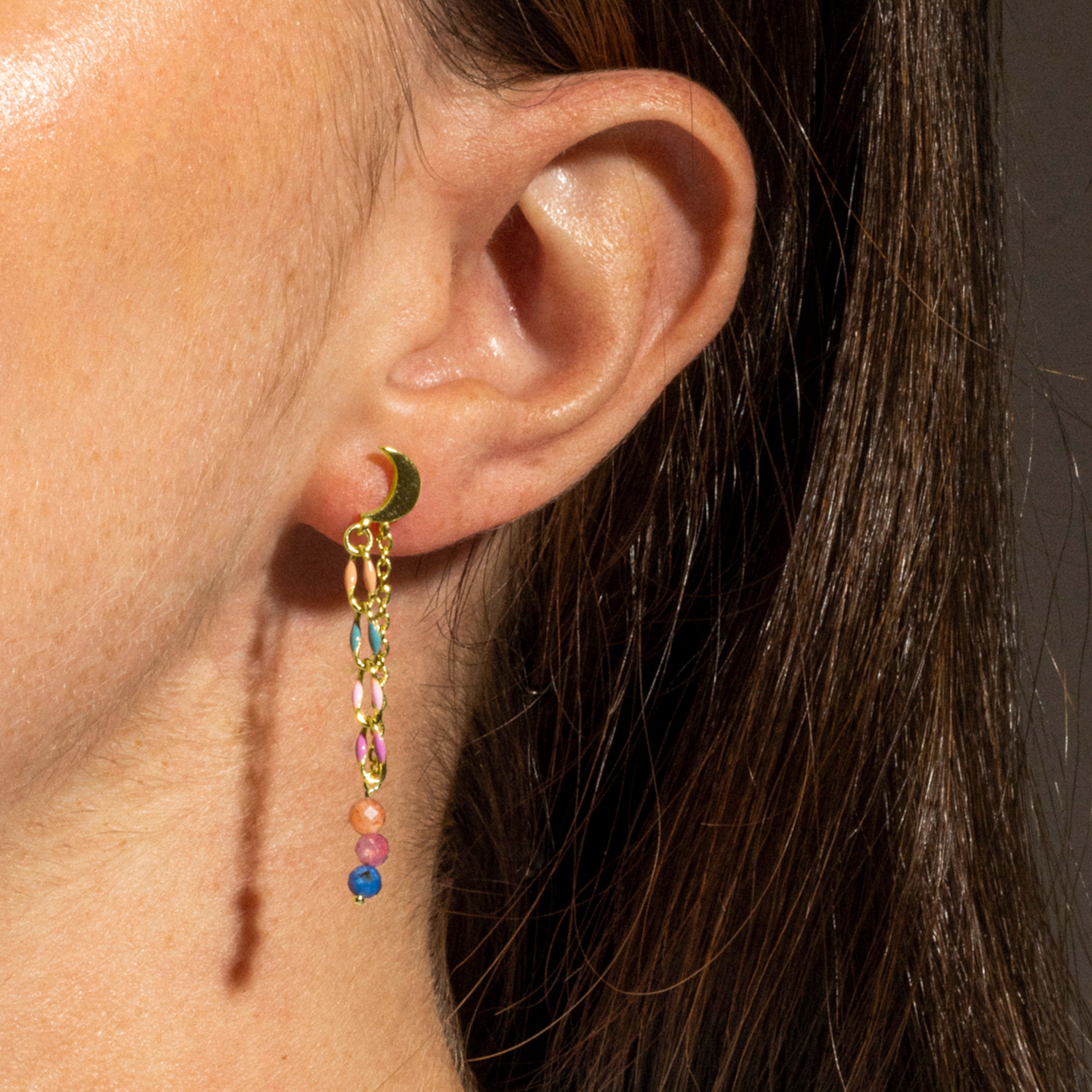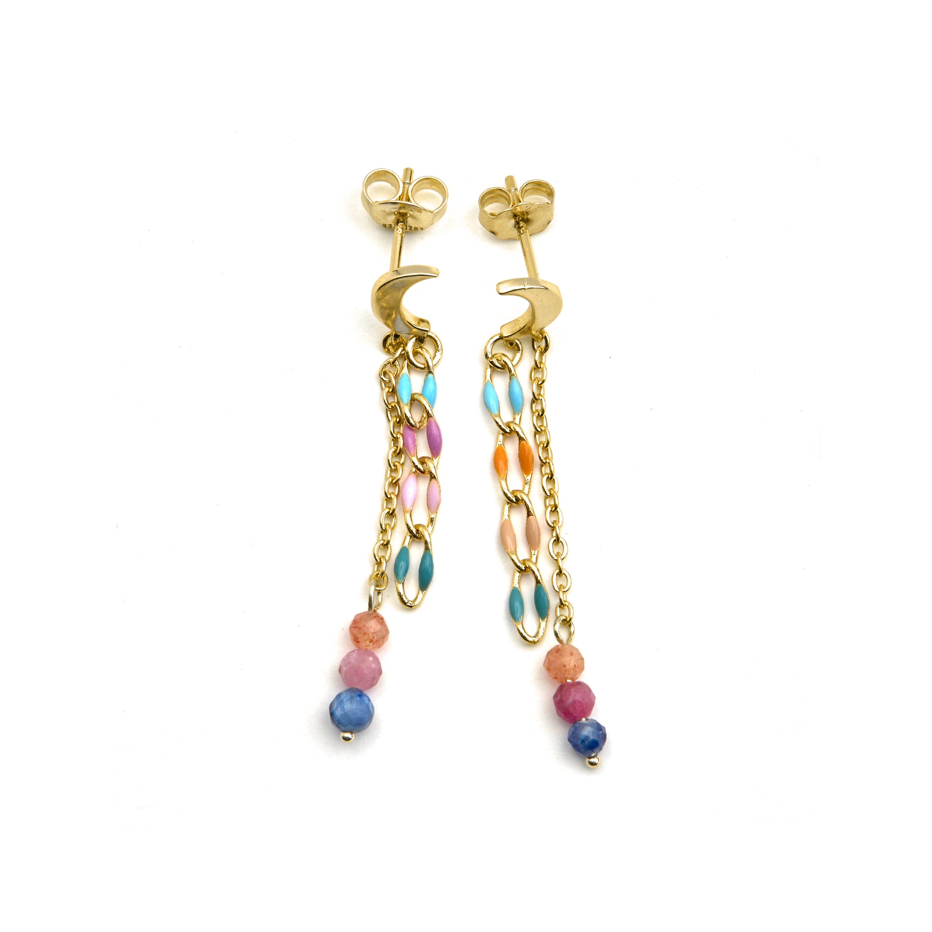 "Liesi earrings made of 925 sterling silver, metal chain, and multicolored crystal with an 18k gold finish. Make a wish is characterized by youthful designs, full of meaning and color, original yet discreet, aiming to become small amulets."