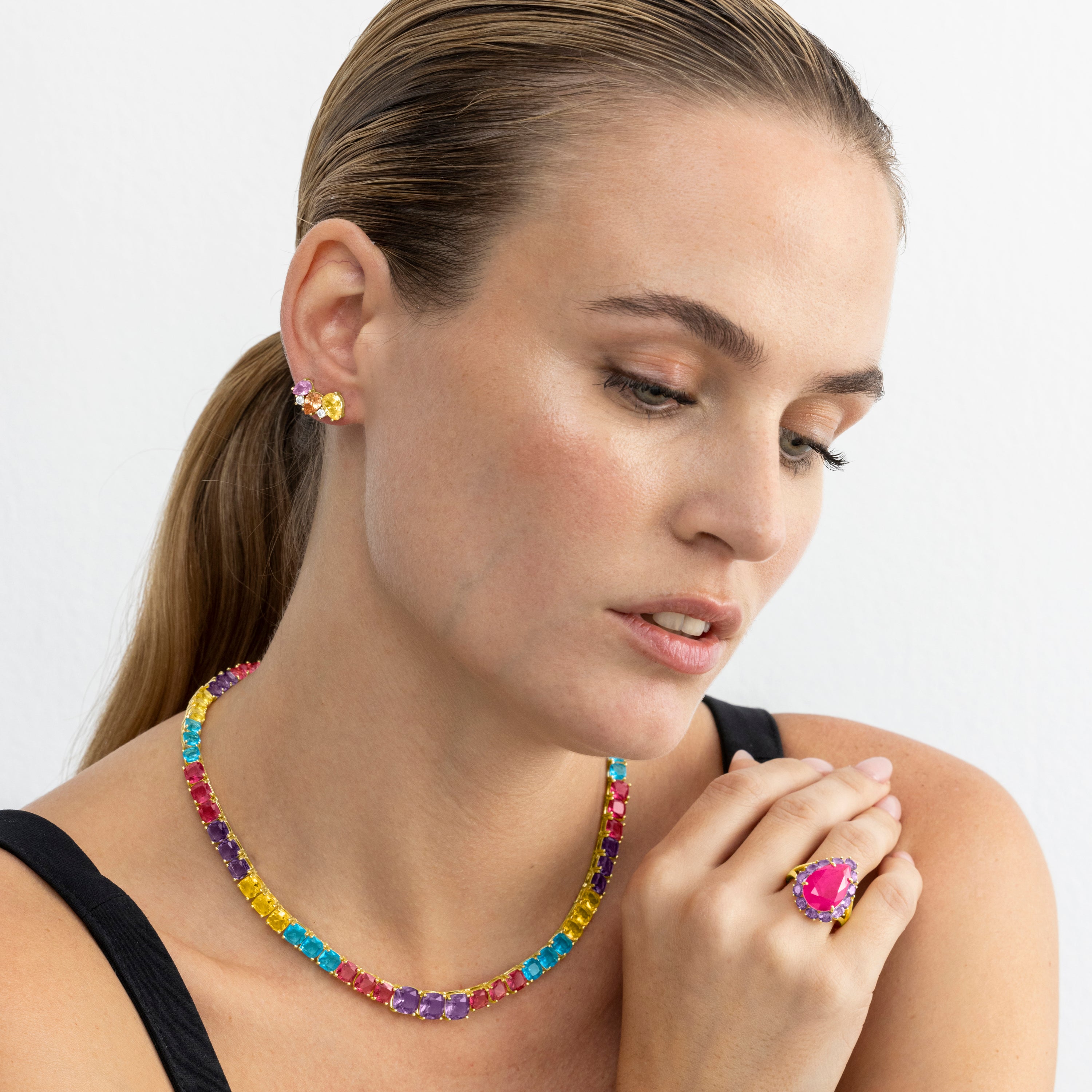 Presentamos "Destellos de Fiesta", una colección de joyas que encapsula la esencia de la elegancia y el color en cada pieza. Diseñada para aquellos momentos especiales donde el brillo y el glamour son protagonistas, esta línea exclusiva se destaca por su uso exquisito de circonitas de colores, creando joyas que son verdaderas obras de arte.Cada pieza de "Destellos de Fiesta" es una celebración de la sofisticación y el espíritu festivo. Los collares, pendientes, anillos y pulseras están engarzados con circonitas que destellan en una paleta vibrante de colores, capturando la luz y reflejándola en un caleidoscopio de tonos. Esta colección está pensada para quienes buscan resplandecer en cualquier evento, desde galas y fiestas hasta reuniones especiales.El diseño de "Destellos de Fiesta" combina líneas clásicas con un toque contemporáneo, asegurando que cada joya no solo sea elegante sino también moderna. La meticulosa atención al detalle y la calidad de los materiales utilizados garantizan que estas piezas no solo brillen con intensidad, sino que también perduren con el tiempo.Deja que "Destellos de Fiesta" te acompañe en tus momentos más memorables. Añade un toque de lujo y color a tu estilo y deja que cada destello refleje tu alegría y elegancia. Porque cada fiesta merece un destello de sofisticación.