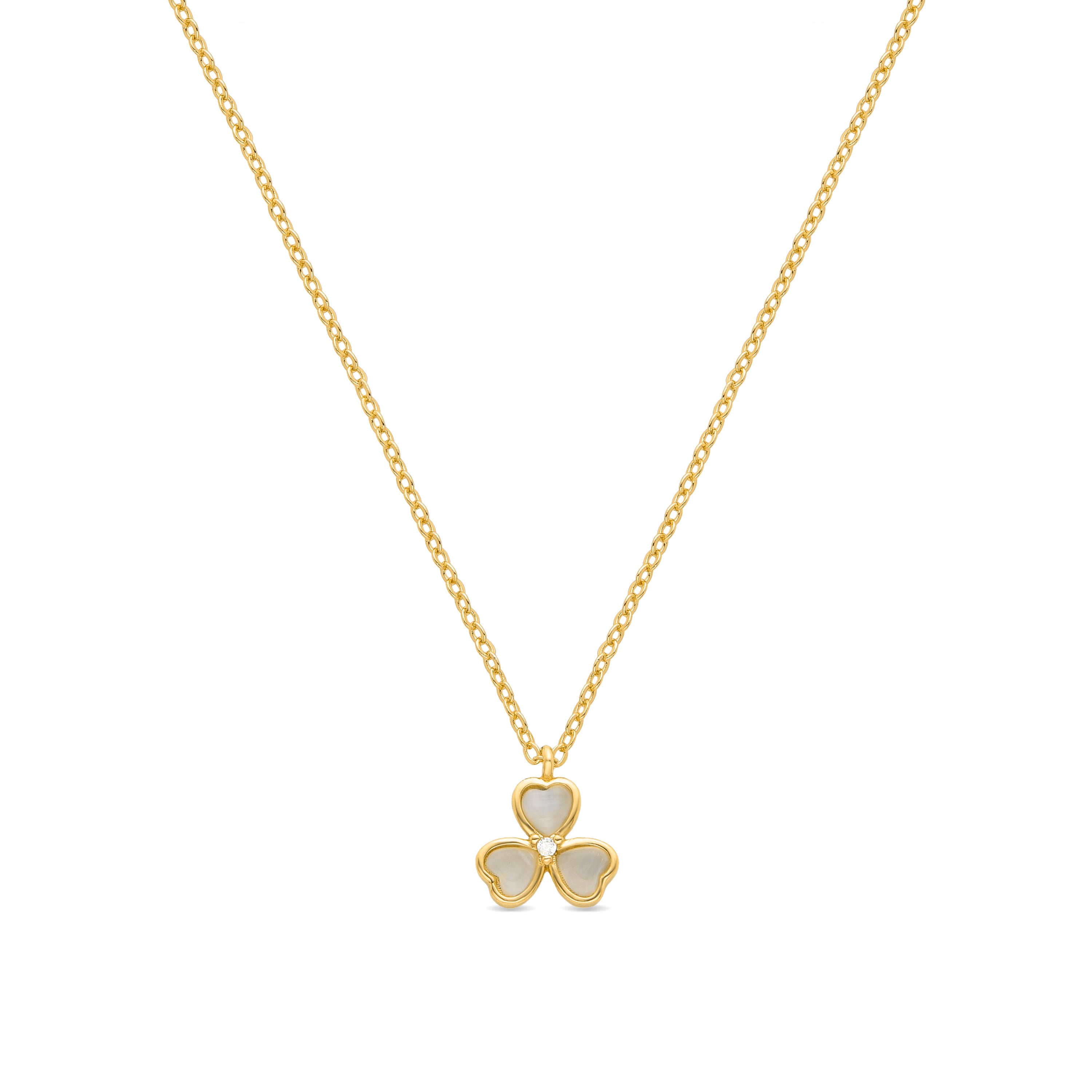 Cat's Eye Clover Necklace finished in 18K yellow gold. África Basic embodies refined simplicity, timeless pieces with soft lines and the added sparkle of cubic zirconia. Unpretentious basic jewelry that is perfect for everyday wear, but can also work for special occasions.