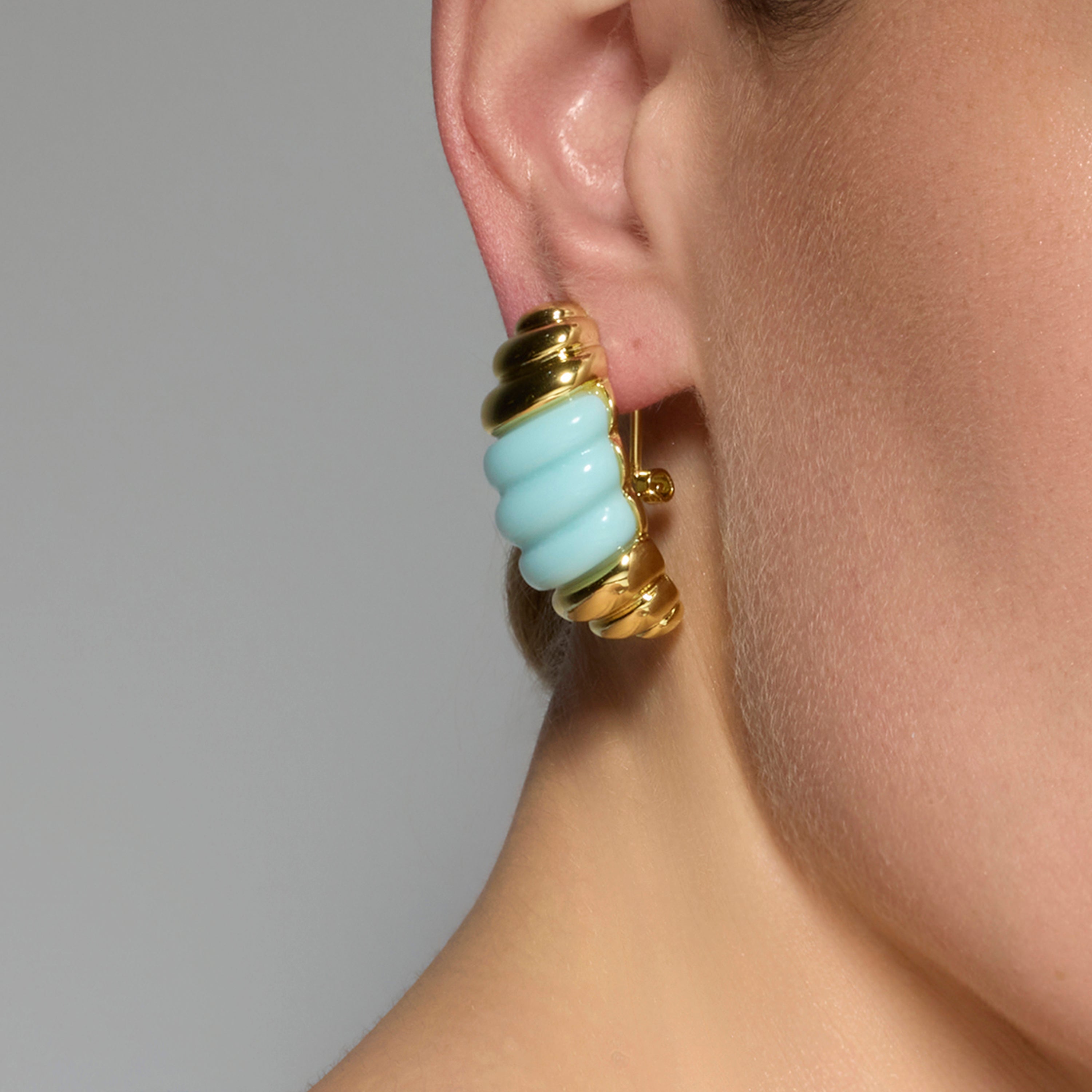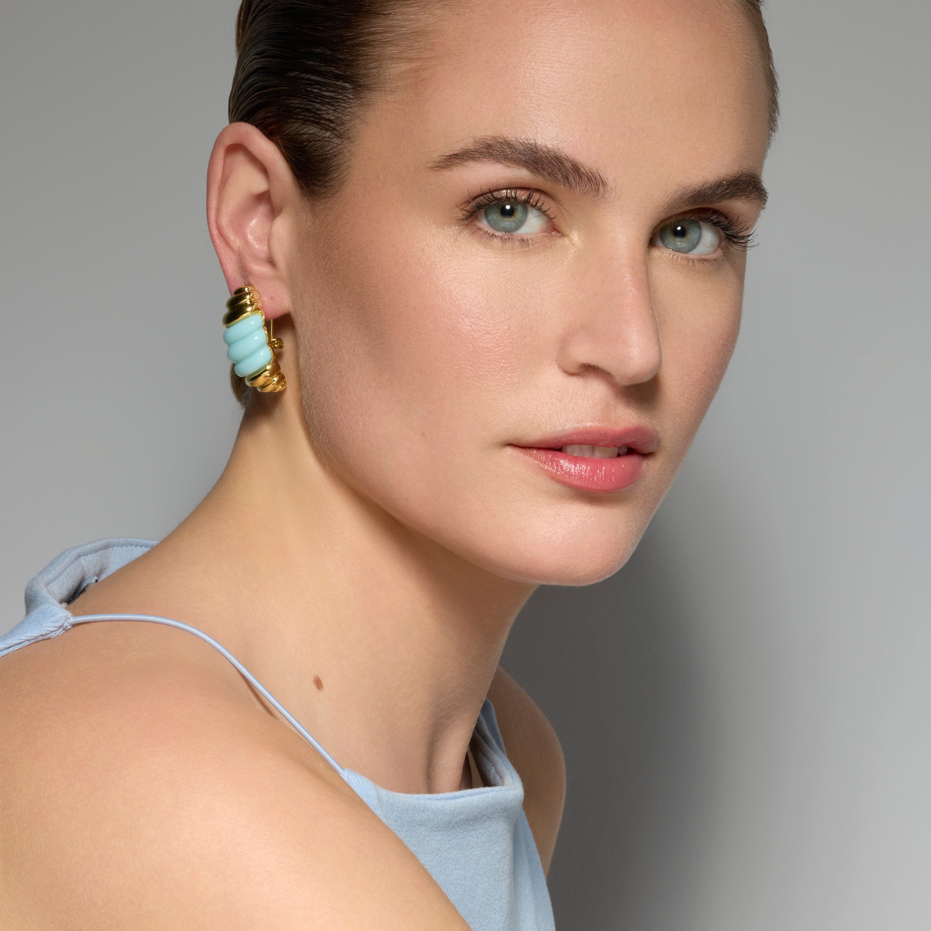 La colección Oasis evoca la frescura y el esplendor de un refugio veraniego en medio del calor, donde la luz se mezcla con la naturaleza para crear una sensación de calma y lujo. Compuesta por joyas de metal en tonos turquesa y madreperla, Oasis resalta la sofisticación y la vitalidad a través de una paleta que recuerda las aguas cristalinas y las suaves conchas del mar.