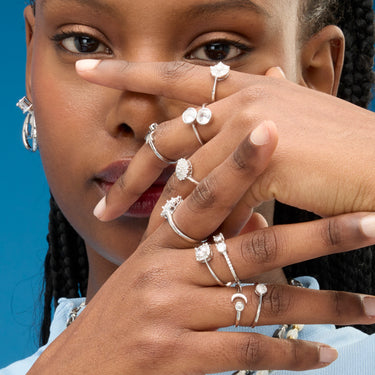 PIDE UN DESEO Perlas y circonitas da nombre a una colección de piezas únicas inspiradas en la belleza de la luz que proporcionan las circonitas multicolores bañadas en rodio, oro amarillo y oro rosa de 18 quilates sobre plata de Ley sobre plata de Ley 925. Joyas que ganan popularidad gracias a su diseño, realizadas a mano con precisión matemática que dan lugar a formas variopintas sobredimensionadas ofreciendo un sinfín de posibilidades.
