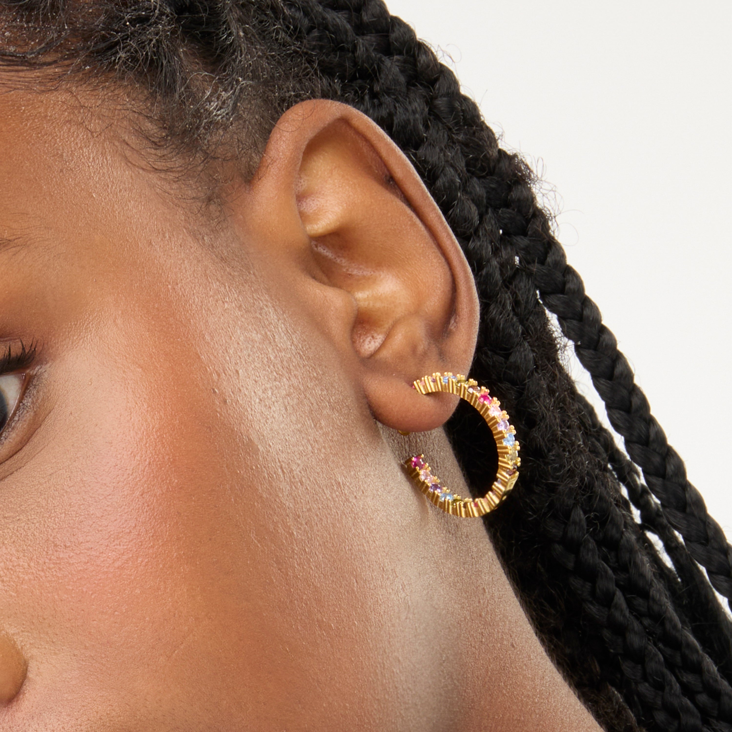Pendientes Vyamba de plata de ley 925 y Circonita Multicolor acabado en baño de oro amarillo de 18 quilates. Trendy representa las tendencias clave en el mundo de la moda. Nuestra línea más espontanea, con un marcado carácter boho y espíritu moderno que concentra en joyas repletas de color entre las que destaca el uso de piedras naturales y diseños en forma de amuletos y talismanes.