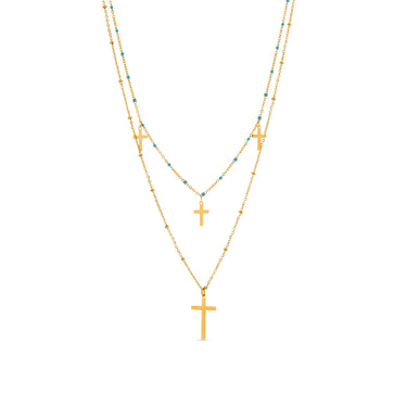 Collar de acero Lidriel de Cristal Azul acabado en oro amarillo de 18k. El estilo Boho es una estética de espíritu libre que mezcla diferentes culturas y expresiones artísticas en un estilo ecléctico con énfasis en los elementos orgánicos y la naturaleza.