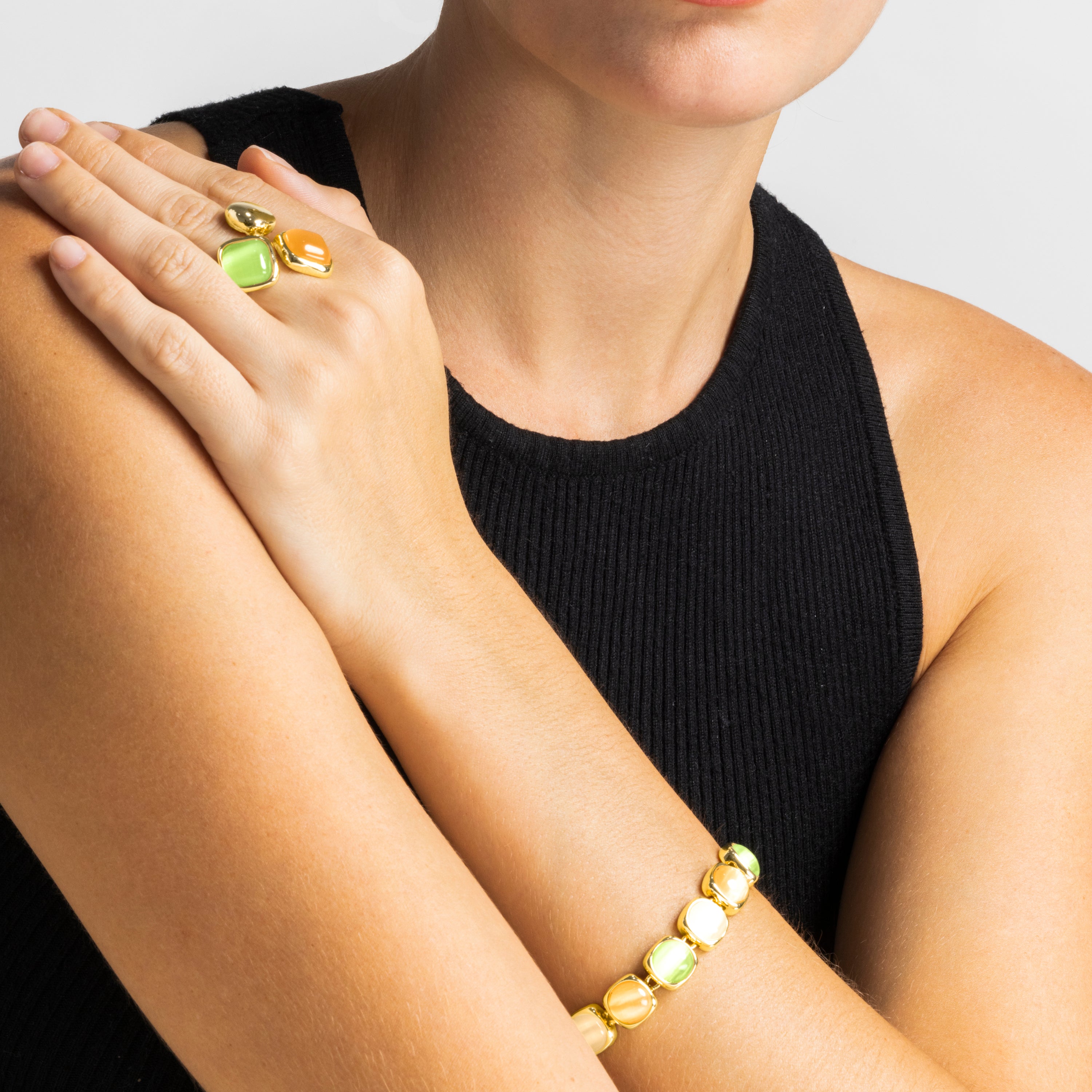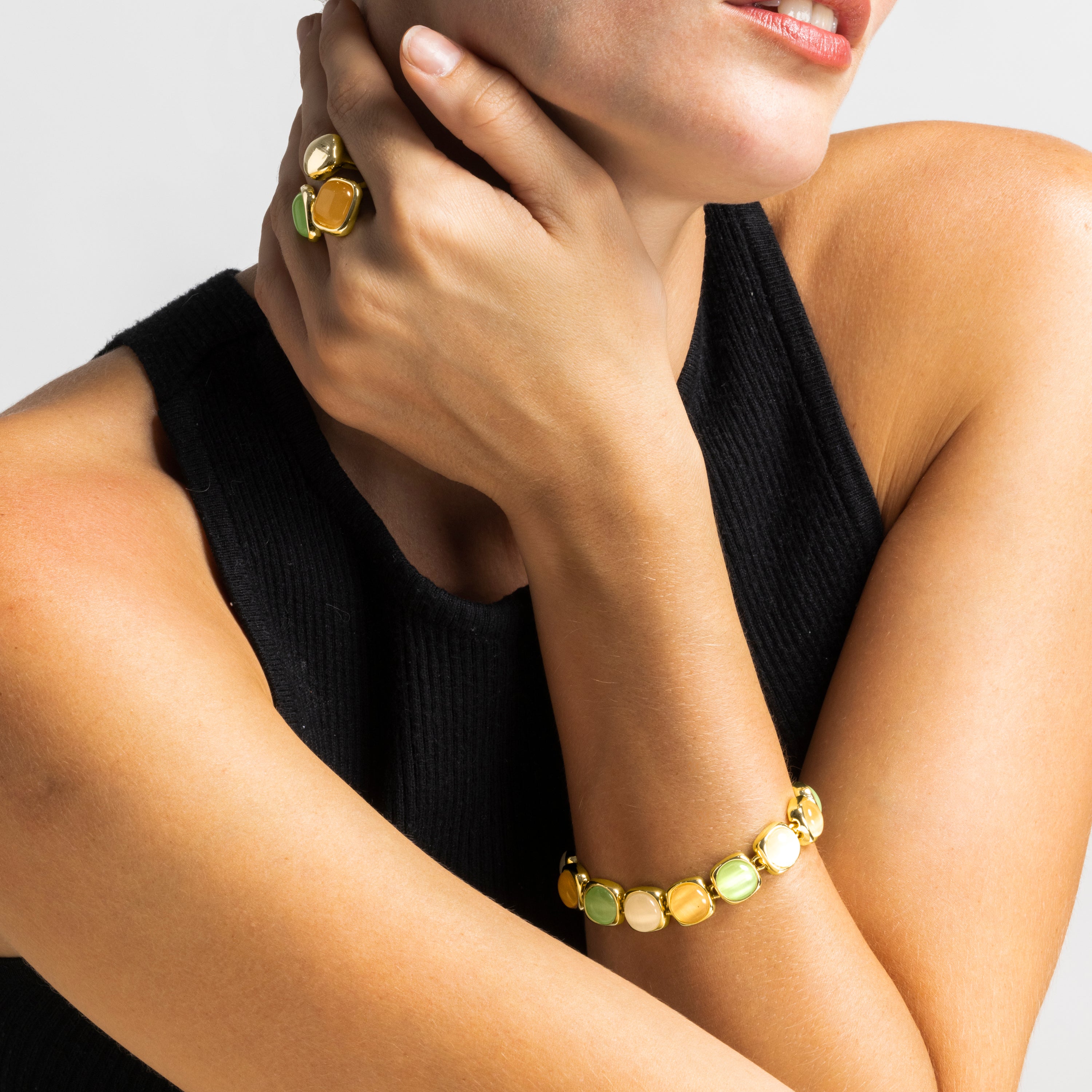 Bienvenidos a la colección "Arcoíris Contemporáneo", donde la modernidad se encuentra con la magia del color. Esta colección de joyas está diseñada para el día a día, combinando lacados multicolor con piedras de ojo de gato en diversos tonos, creando piezas que son tanto elegantes como vibrantes.