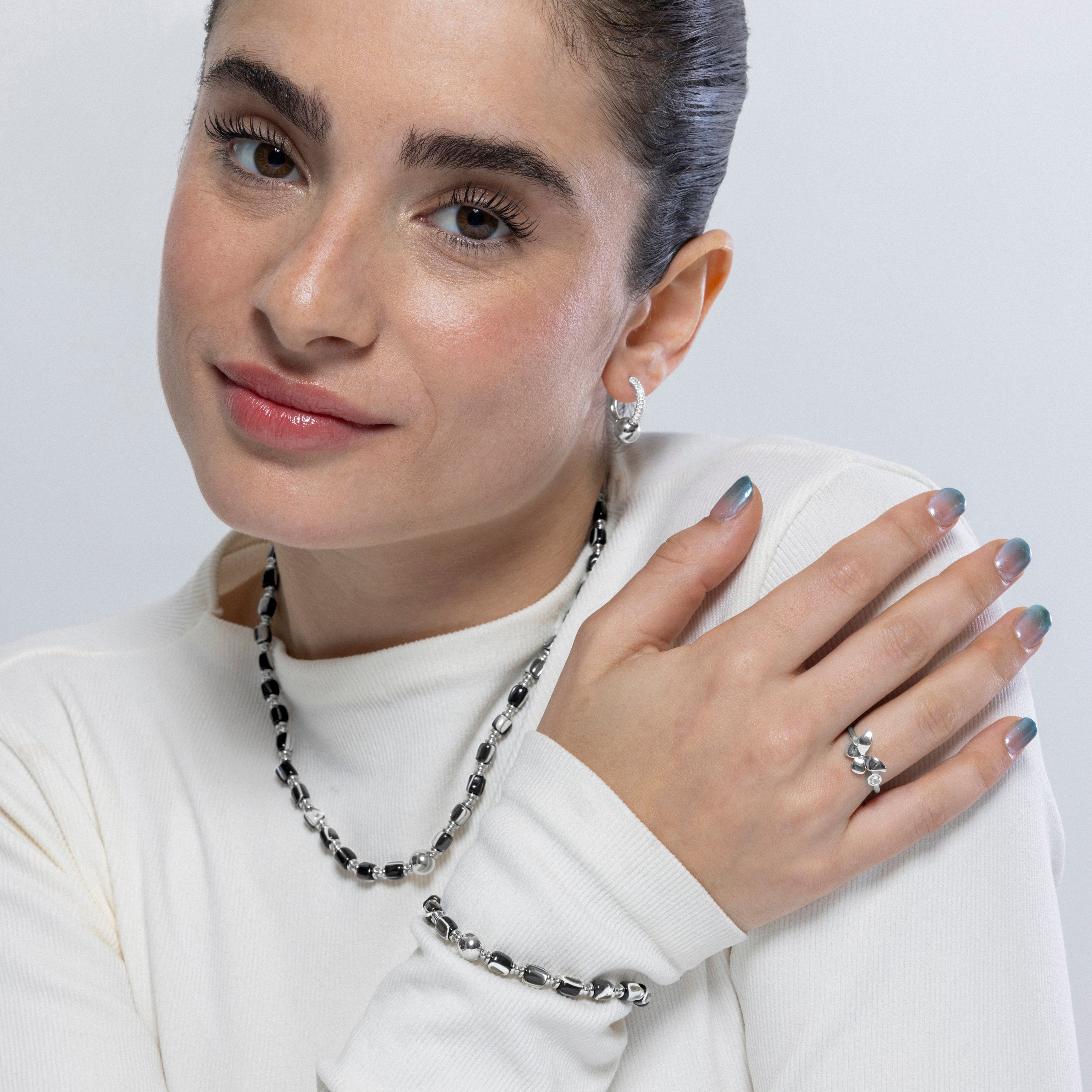 Demandez un désir de perles et de zirconitas à une collection de pièces uniques inspirées de la beauté de la lumière qui fournissent les circonlodes multicolores baignés de rhodium, d'or jaune et d'or rose 18 carats sur la loi sur la loi du droit 925. Bijoux qu'ils gagnent en popularité Grâce à leur conception, fait à la main avec une précision mathématique qui donne naissance à des formes diverses surdimensionnées offrant des possibilités infinies.