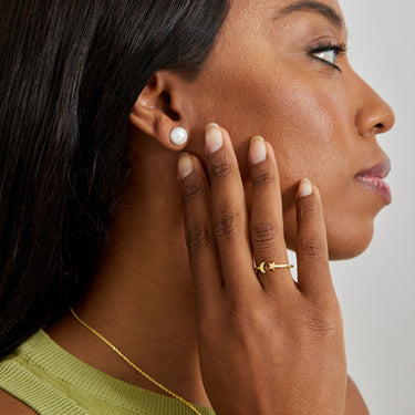 Bague Onsah finition en plaqué or jaune 18 carats. Africa Basic incarne la simplicité raffinée, des pièces intemporelles aux lignes douces et à l'éclat supplémentaire des zircones. Bijoux basiques sans prétention parfaits pour un usage quotidien, mais pouvant aussi convenir pour des occasions spéciales.