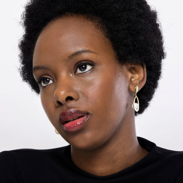 Boucles d'oreilles Mayla finition or jaune 18K. Africa Basic incarne la simplicité raffinée, des pièces intemporelles aux lignes douces et à l'éclat supplémentaire des zircones. Bijoux basiques sans prétention parfaits pour un usage quotidien, mais qui peuvent aussi convenir pour des occasions spéciales.