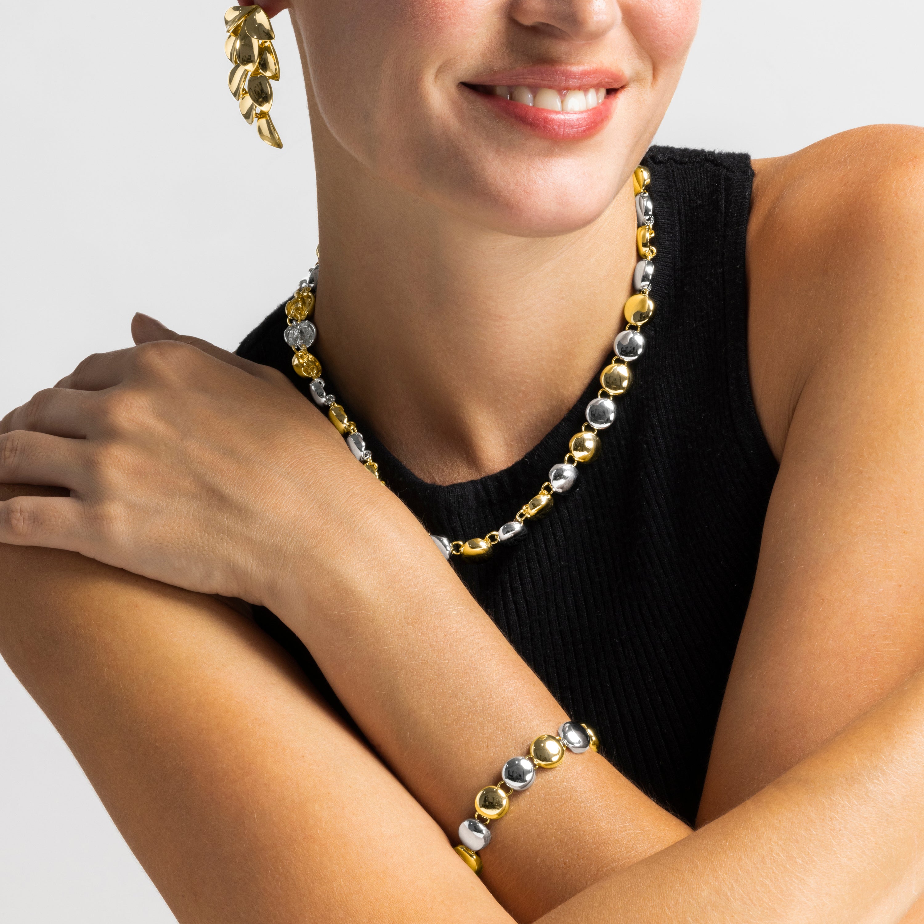 La "dualité de luxe" célèbre le contraste et la complémentarité de l'or chaud et de l'argent froid, créant des bijoux qui se distinguent pour leur audace et leur sophistication. Chaque collier long et chaque bracelet épais est un chef-d'œuvre de design, conçu pour les femmes qui souhaitent faire une déclaration puissante et élégante.