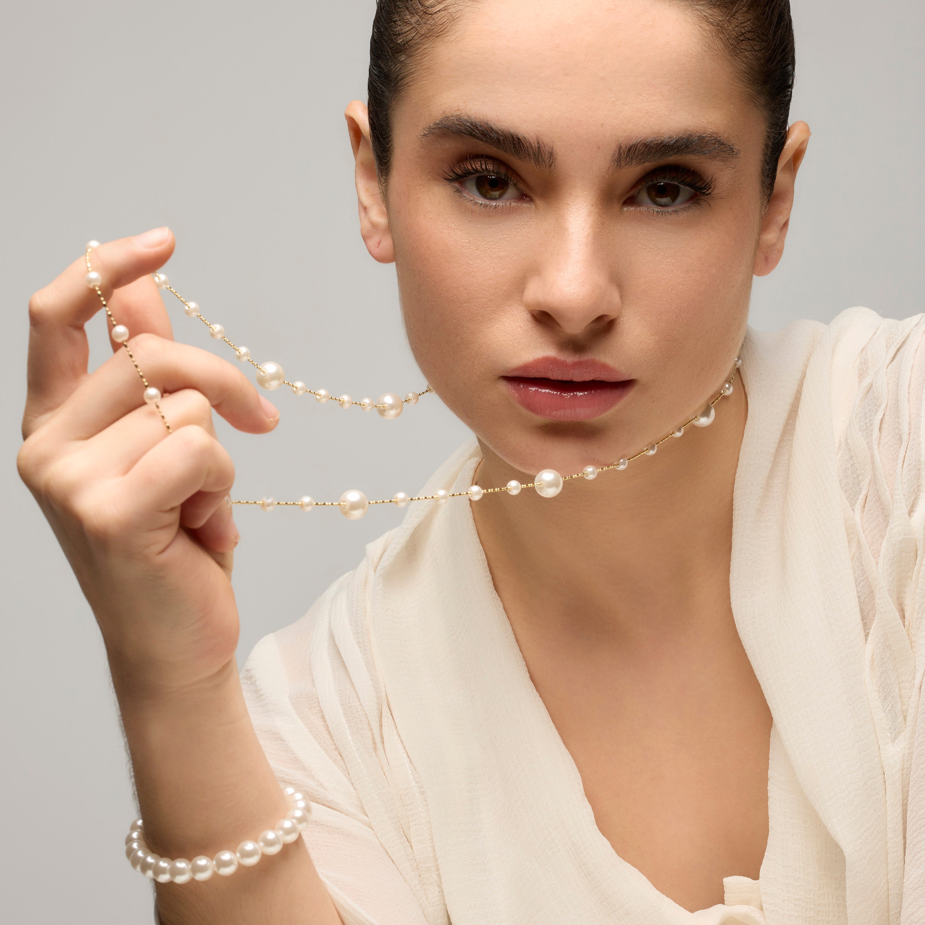 Bracelet Anrae avec perle blanche finition or 18k. Essential incarne la simplicité raffinée, des pièces intemporelles aux lignes douces et à l'éclat supplémentaire des zircones. Bijoux basiques sans prétention, parfaits pour un usage quotidien, mais qui peuvent aussi convenir pour des occasions spéciales.