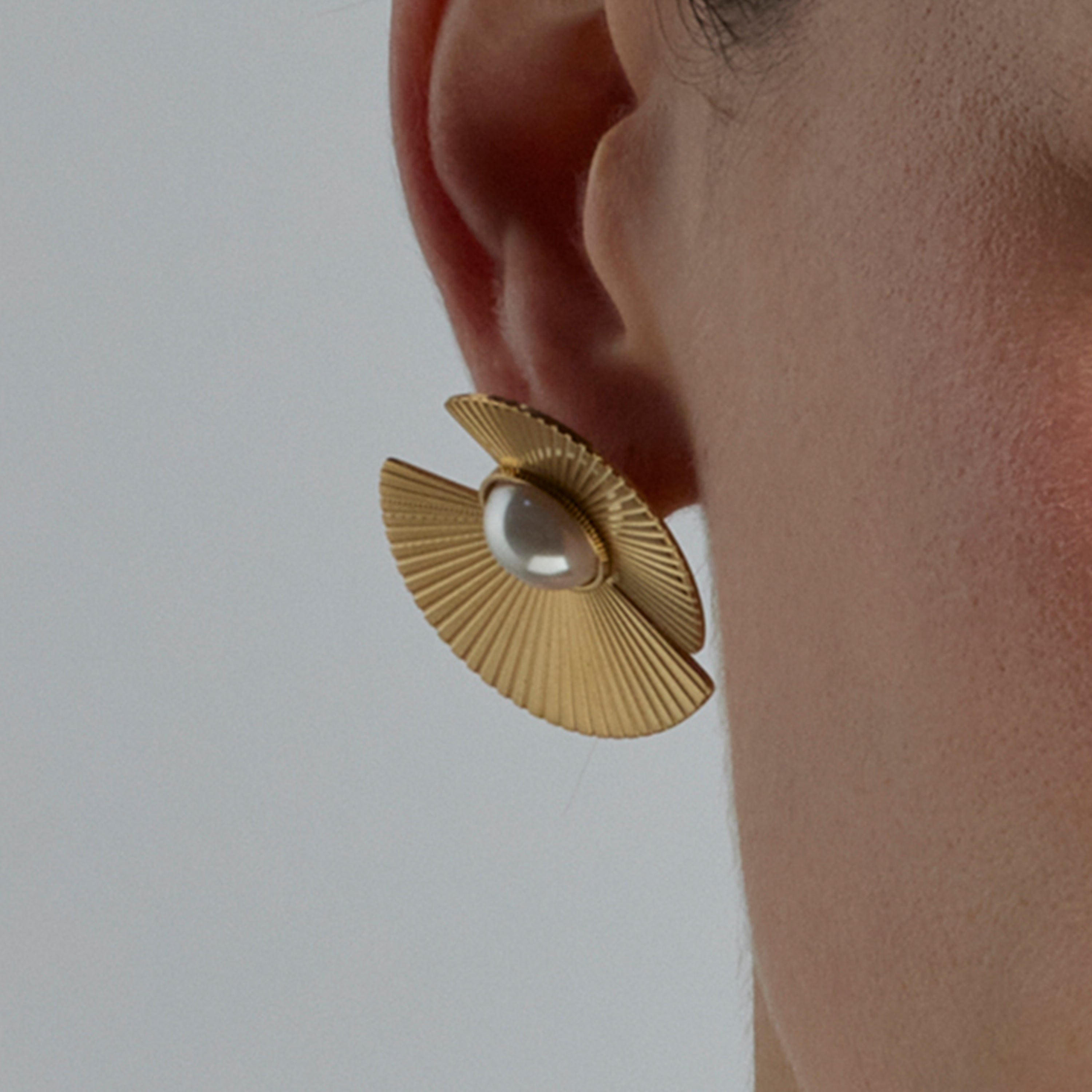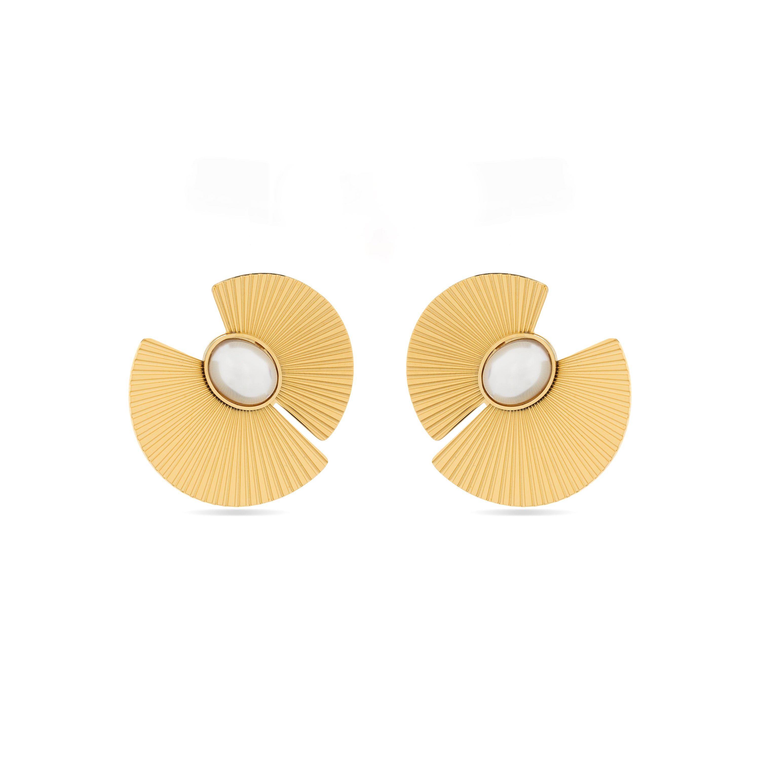 Boucles d'oreilles en acier Lessa avec perle blanche finies en or jaune 18K. Afrique devient la ligne parfaite pour les femmes avec de la personnalité, qui n'ont pas peur de prendre des risques et de porter des pièces avec un caractère propre.