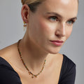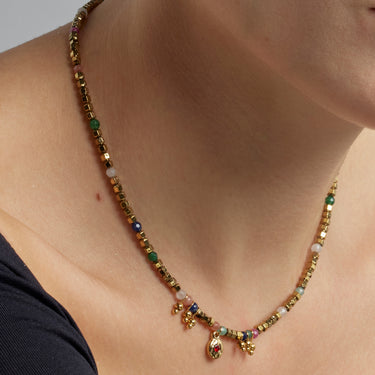 Collier Damya avec cristal multicolore finition or 18k. Le style Boho est une esthétique d'esprit libre qui mélange différentes cultures et expressions artistiques dans un style éclectique mettant l'accent sur les éléments organiques et la nature.