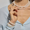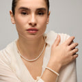 Collier Jamel avec perle blanche finition or 18k. Essential incarne la simplicité raffinée, des pièces intemporelles aux lignes douces et à l'éclat supplémentaire des zircones. Bijoux basiques sans prétention parfaits pour un usage quotidien, mais qui peuvent aussi convenir pour des occasions spéciales.