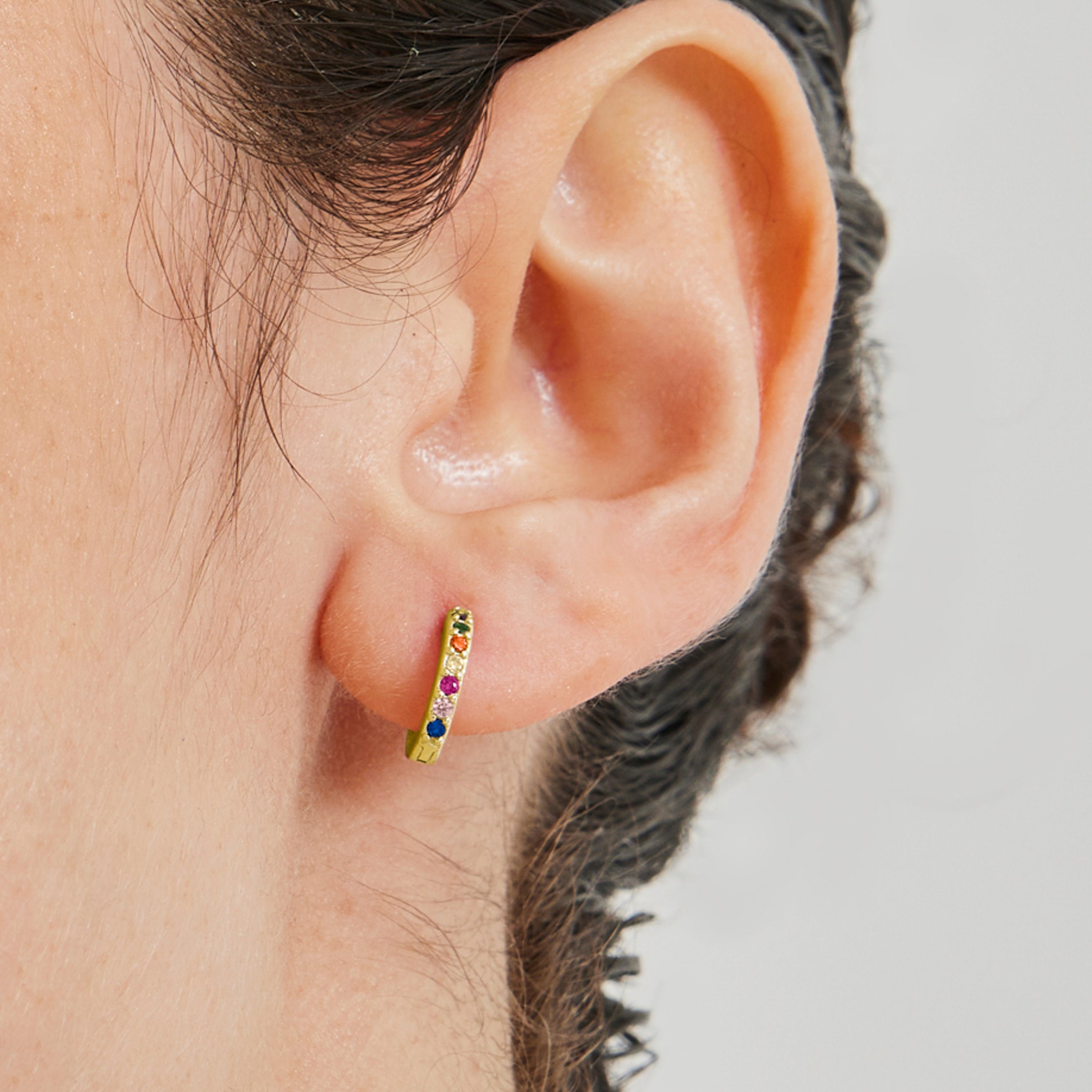 Boucles d'oreilles Leofcar en argent sterling 925 et zircon multicolore, finies en or jaune 18 carats. Trendy représente les tendances clés dans le monde de la mode. Notre ligne la plus spontanée, avec un caractère boho marqué et un esprit moderne, se concentre sur des bijoux remplis de couleur, mettant en avant l'utilisation de pierres naturelles et des designs en forme d'amulettes et talismans.