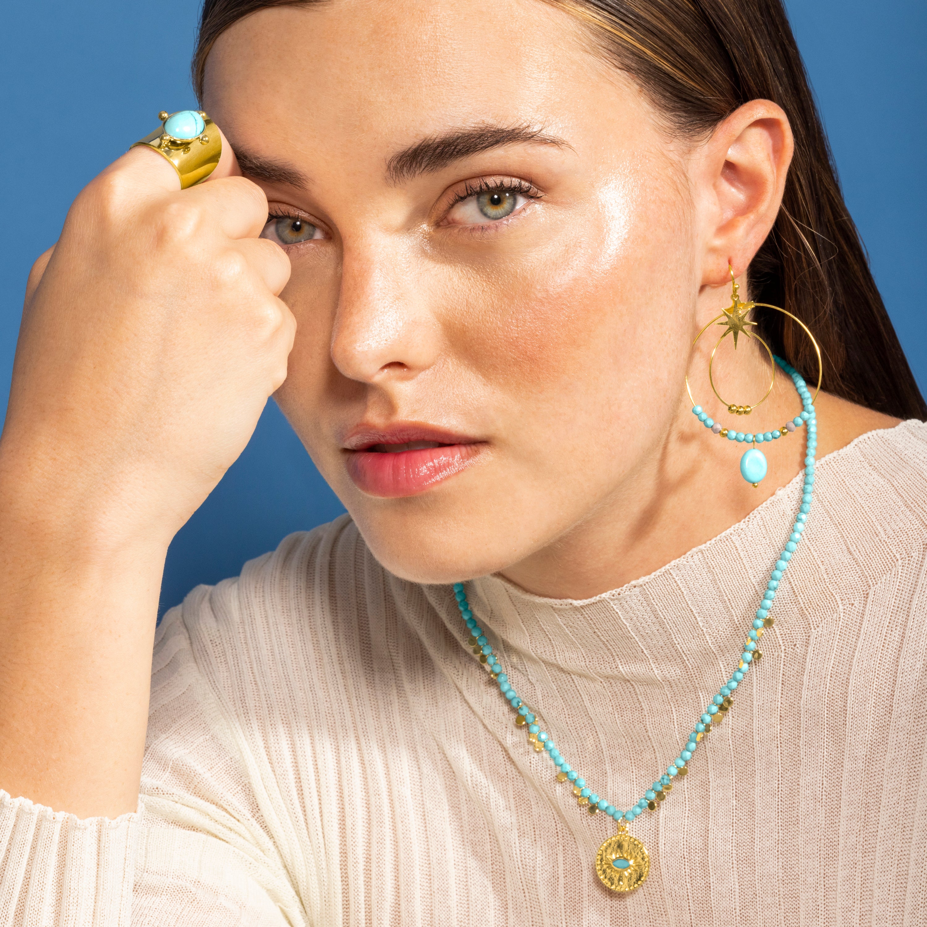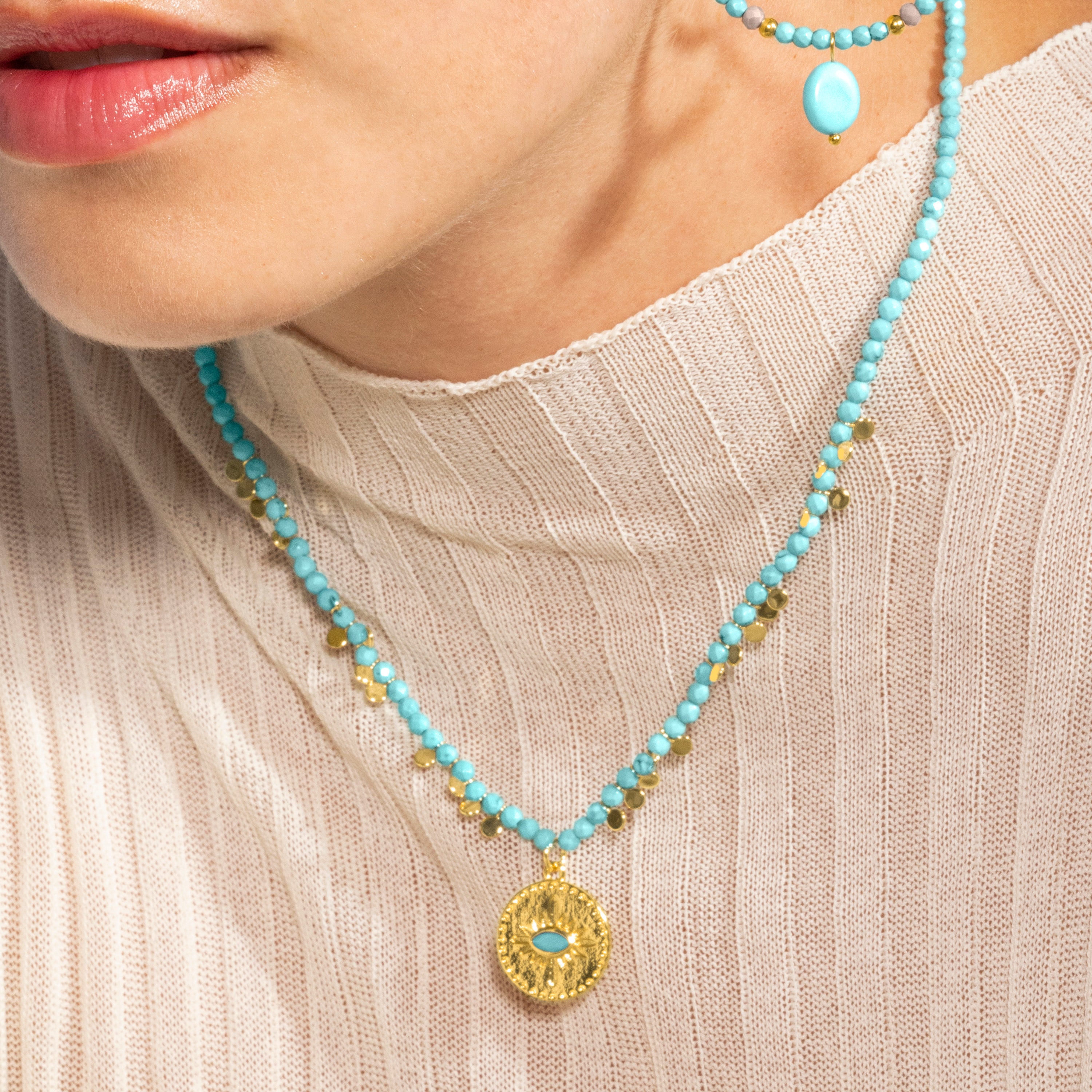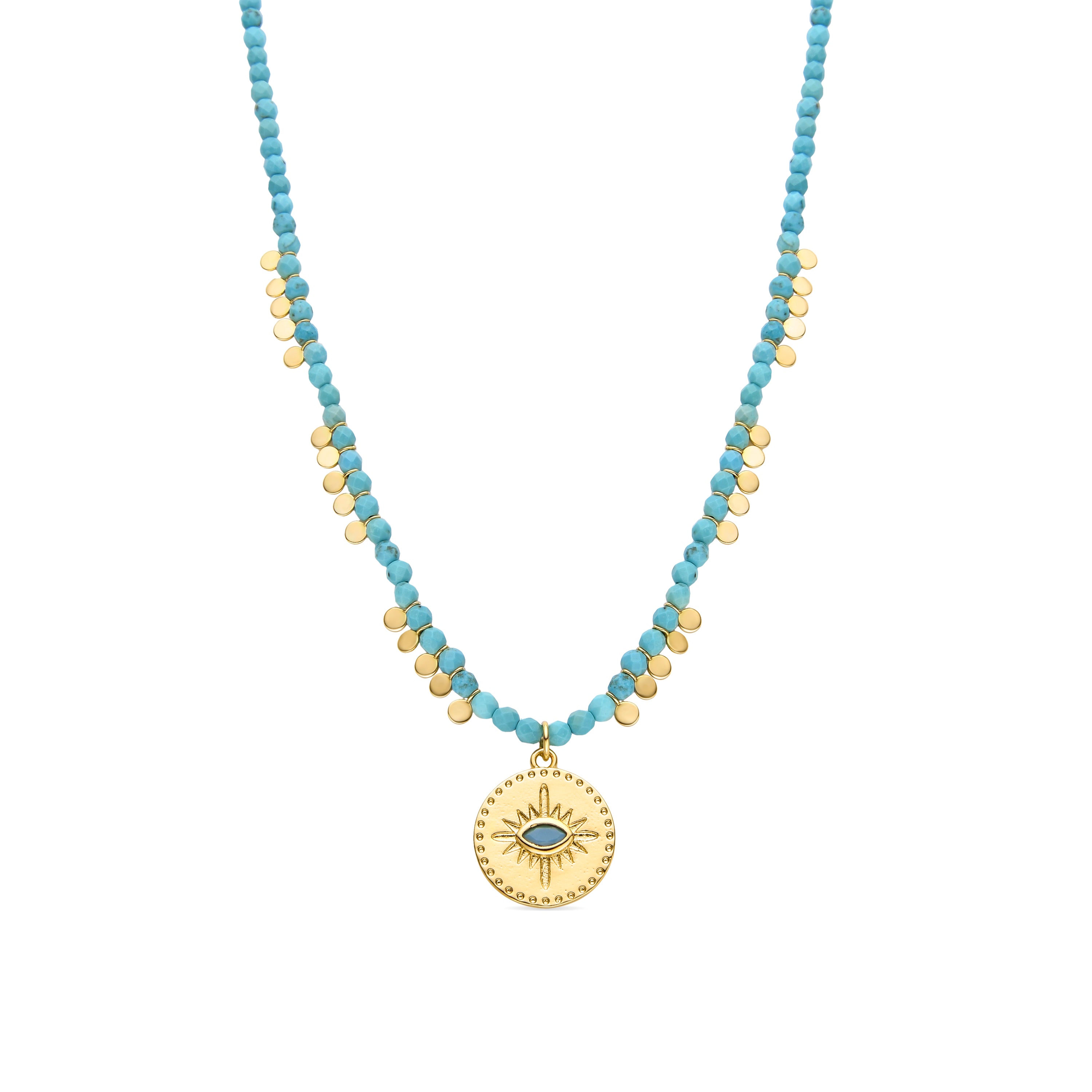 Collana Arleo pendente in metallo, chiusura in Argento Sterling 925 e Turchese finitura in oro giallo 18 carati. Trendy rappresenta le tendenze chiave nel mondo della moda. La nostra linea più spontanea, con un carattere boho marcato e uno spirito moderno che si concentra in gioielli ricchi di colore tra cui spicca l'uso di pietre naturali e design a forma di amuleti e talismani.